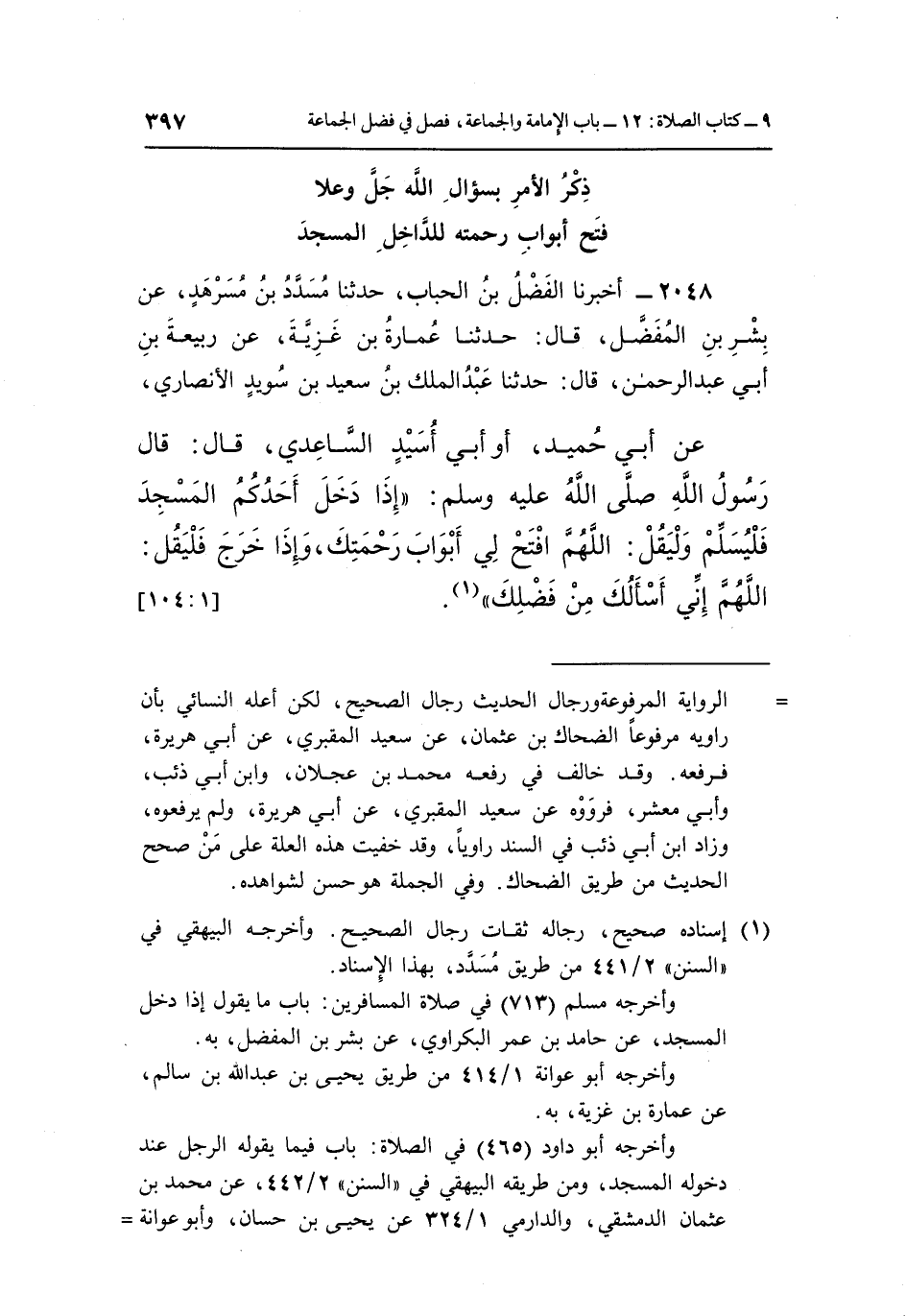 عَنْ أَبِي حُمَيْدٍ أَوْ أَبِي أُسَيْدٍ السَّاعِدِيِّ قَالَ قَالَ رَسُولُ اللَّهِ صَلَّى اللَّهُ عَلَيْهِ وَسَلَّمَ: "إِذَا دَخَلَ أَحَدُكُمُ الْمَسْجِدَ فَلْيُسَلِّمْ وَلْيَقُلِ اللَّهُمَّ افْتَحْ لِي أَبْوَابَ رَحْمَتِكَ وَإِذَا خَرَجَ فَلْيَقُلِ اللَّهُمَّ إِنِّي أَسْأَلُكَ مِنْ فَضْلِكَ" 1. [1: 104]
