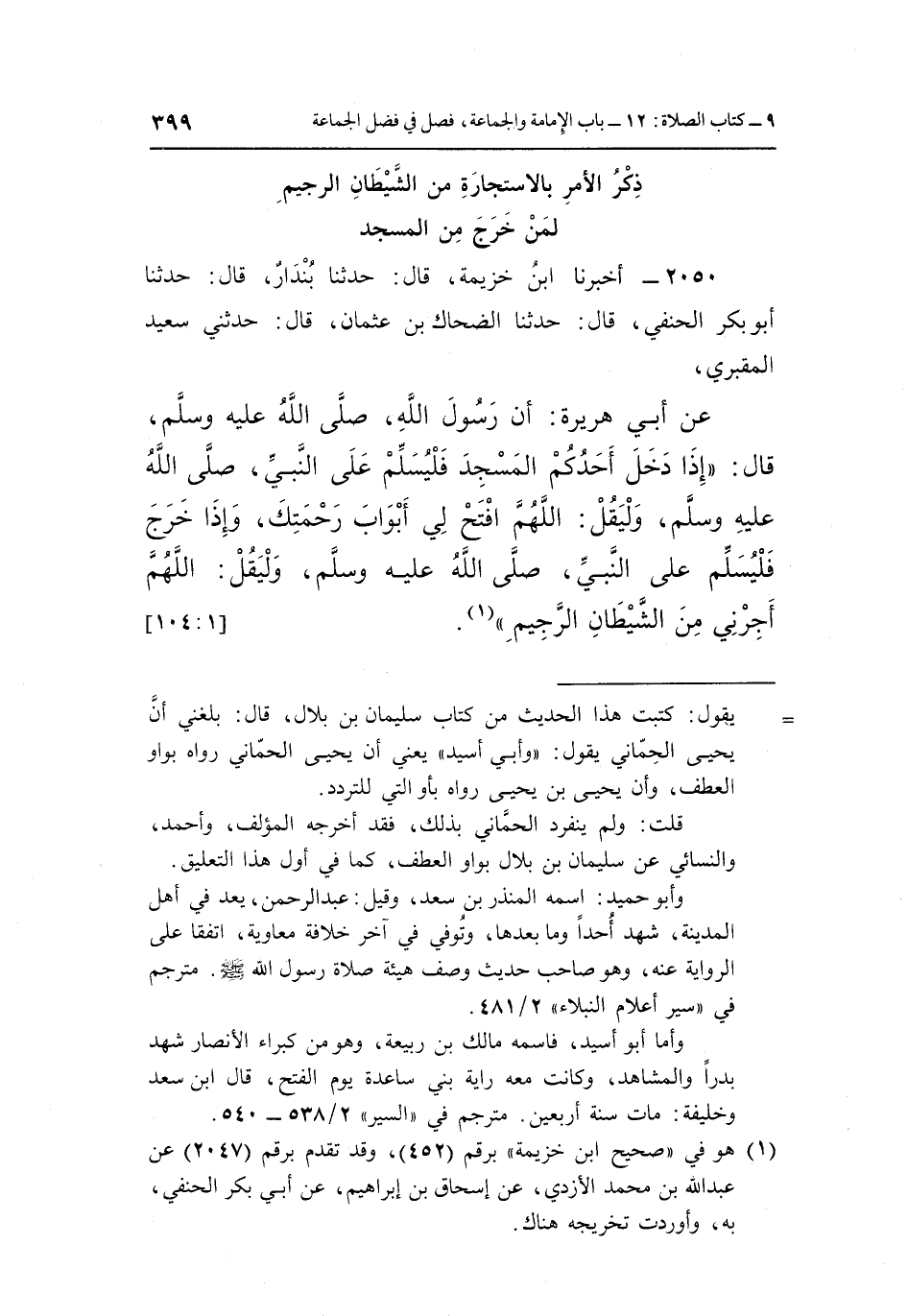 1 هو في صحيح ابن خزيمة برقم "452"، وقد تقدم برقم "2047" عن عبد الله بن محمد الأزدي، عن إسحاق بن إبراهيم، عن أبي بكر الحنفي، به، وأوردت تخريجه هناك.