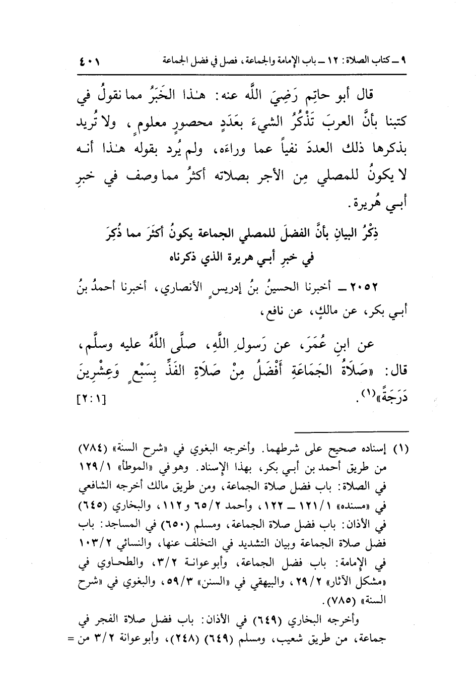 عَنِ ابْنِ عُمَرَ عَنْ رَسُولِ اللَّهِ صَلَّى اللَّهُ عَلَيْهِ وَسَلَّمَ قَالَ: "صَلَاةُ الْجَمَاعَةِ أَفْضَلُ مِنْ صَلَاةِ الْفَذِّ بِسَبْعٍ وَعِشْرِينَ درجة" 1. [1: 2]