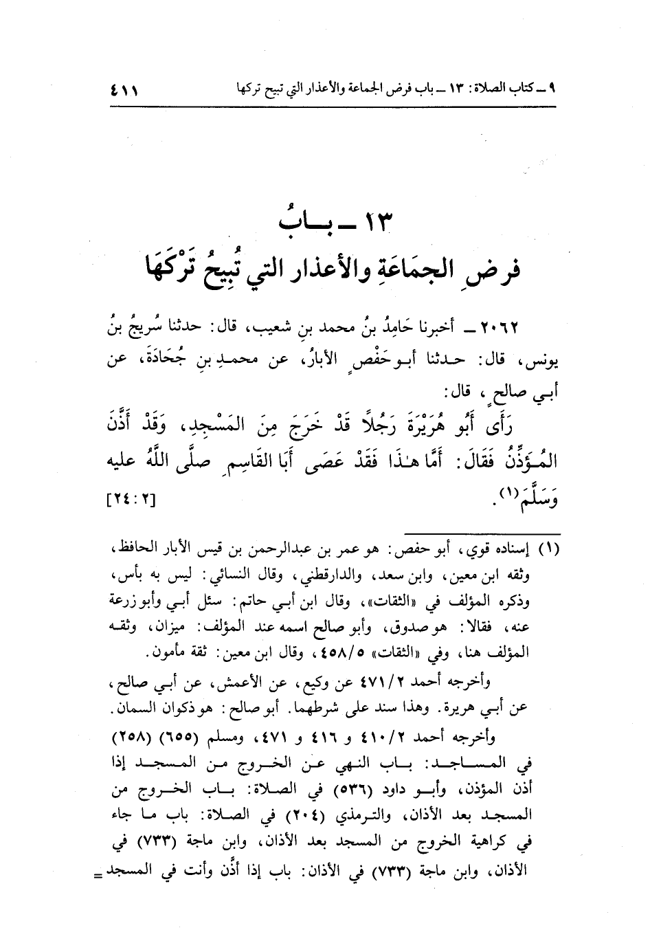 2062 - أَخْبَرَنَا حَامِدُ بْنُ مُحَمَّدِ بْنِ شُعَيْبٍ قَالَ: حَدَّثَنَا سُرَيْجُ بْنُ يُونُسَ قَالَ: حَدَّثَنَا أَبُو حَفْصٍ الْأَبَّارُ عَنْ مُحَمَّدِ بْنِ جُحَادَةَ عَنْ أَبِي صَالِحٍ، قَالَ:
