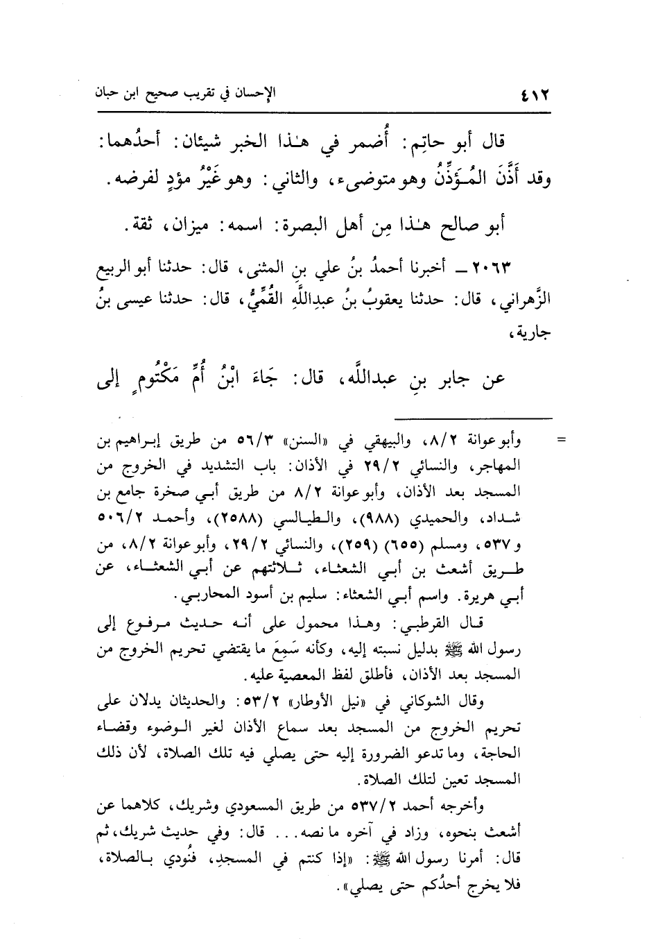 = وأبو عوانة 2/8، والبيهقي في السنن 3/56 من طريق إبراهيم بن المهاجر، والنسائي /29 في الأذان: باب الشديد في الخروج من المسجد بعد الأذان، وأبو عوانة 2/8 من طريق أبي صخرة جامع بن شداد، الحميدي "977"، والطيالسي "2588"، وأحمد 2/506و537، ومسلم "655" "259"، والنسائي 2/29، وأبو عوانة 2/8، من طريق أشعت بن أبي الشعثاء، ثلاثتهم عن أبي الشعثاء، عن أبي هريرة. واسم أبي الشعثاء: سليم بن أسود المحاربي.