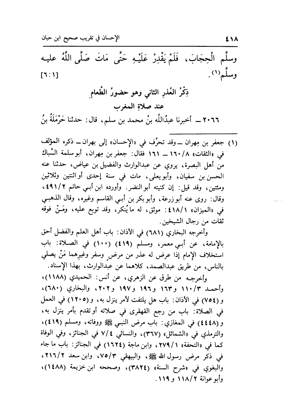 1 حديث صحيح، جعفر بن مهران – وقد تحرف في الإحسان إلى بهران – ذكره المؤلف في الثقات 8/160-161 فقال: جعفر بن مهران، أبو سلمة السباك من أهل البصرة، يروي عن عبد الوارث والفضيل بن عياض، حدثنا عنه الحسن بن سفيان، وأبو يعلى، مات في سنة إحدى أو اثنتين وثلاثين ومئتين، وقد قيل: إن كنيته أبو النضر. وأورده ابن أبي حاتم 2/491، وقال: روى عنه أبو زرعة، وأبو بكر بن أبي القاسم وغيره، وقال الذهبي في الميزان 1/418: موثق، له ما ينكر، وقد توبع عليه، ومن فوقه ثقات من رجال الشيخين.