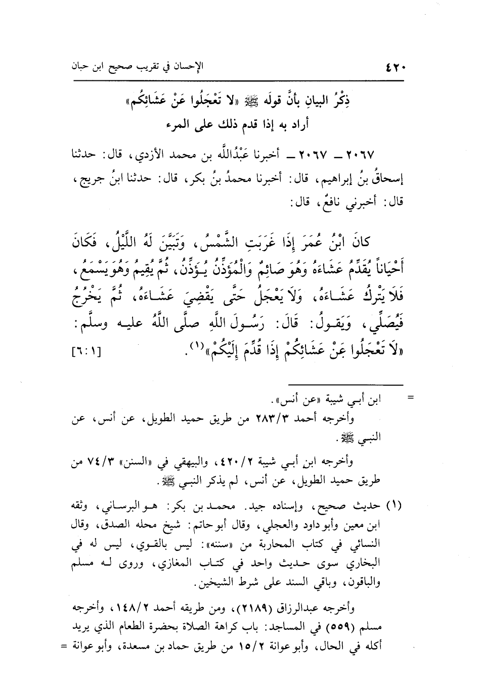 كان بن عُمَرَ إِذَا غَرَبَتِ الشَّمْسُ وَتَبَيَّنَ لَهُ اللَّيْلُ فَكَانَ أَحْيَانًا يُقَدِّمُ عَشَاءَهُ وَهُوَ صَائِمٌ وَالْمُؤَذِّنُ يُؤَذِّنُ ثُمَّ يُقِيمُ وَهُوَ يَسْمَعُ فَلَا يَتْرُكُ عَشَاءَهُ وَلَا يُعَجِّلُ حَتَّى يَقْضِيَ عَشَاءَهُ ثُمَّ يَخْرُجَ فَيُصَلِّيَ وَيَقُولُ قَالَ رَسُولُ اللَّهِ صَلَّى اللَّهُ عَلَيْهِ وَسَلَّمَ: "لَا تَعْجَلُوا عَنْ عَشَائِكُمْ إذا قدم إليكم" 1. [1: 6]