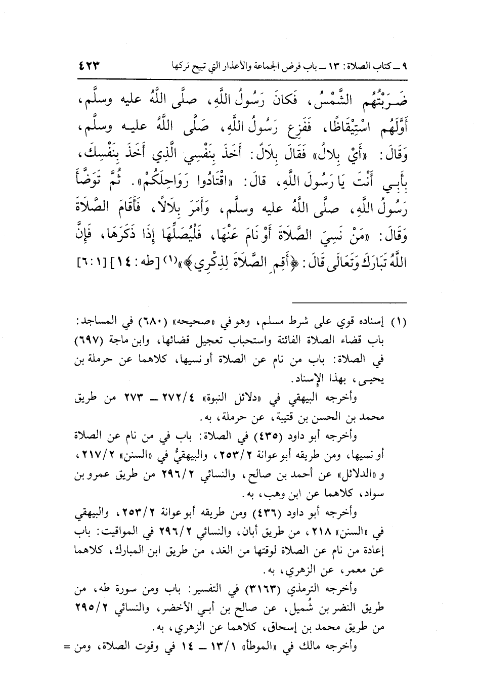 ضَرَبَتْهُمُ الشَّمْسُ فَكَانَ رَسُولُ اللَّهِ صَلَّى اللَّهُ عَلَيْهِ وَسَلَّمَ أَوَّلَهُمُ اسْتِيقَاظًا فَفَزِعَ رَسُولُ اللَّهِ صَلَّى اللَّهُ عَلَيْهِ وَسَلَّمَ وَقَالَ: "أَيْ بِلَالُ" فَقَالَ بِلَالٌ أَخَذَ بِنَفْسِي الَّذِي أَخَذَ بِنَفْسِكَ بِأَبِي أَنْتَ يَا رَسُولَ اللَّهِ قَالَ: "اقْتَادُوا رَوَاحِلَكُمْ" ثُمَّ تَوَضَّأَ رَسُولُ اللَّهِ صَلَّى اللَّهُ عَلَيْهِ وَسَلَّمَ وَأَمَرَ بلال فَأَقَامَ الصَّلَاةَ وَقَالَ: " مَنْ نَسِيَ الصَّلَاةَ أَوْ نَامَ عَنْهَا فَلْيُصَلِّهَا إِذَا ذَكَرَهَا فَإِنَّ اللَّهَ تبارك وتعالى قال: {وَأَقِمِ الصَّلاةَ لِذِكْرِي} " 1 [طه: 14] . [1: 6]