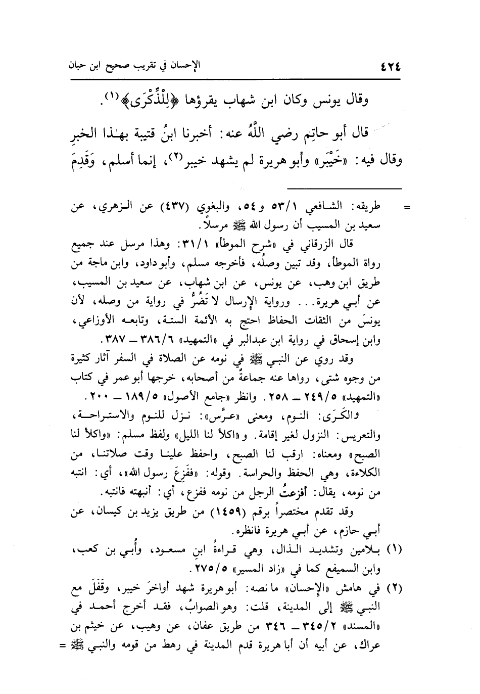 2 في هامش الإحسان ما نصه: أبو هريرة شهد أواخر خيبر، وقفل مع النبي صلى الله عليه وسلم إلى المدينة، قلت: وهو الصواب، فقد أخرج أحمد في المسند 2/345-346 من طريق عفان، عن وهيب، عن خيثم بن عراك، عن أبيه أن أبا هريرة قدم المدينة في رهط من قومه والنبي صلى الله عليه وسلم =