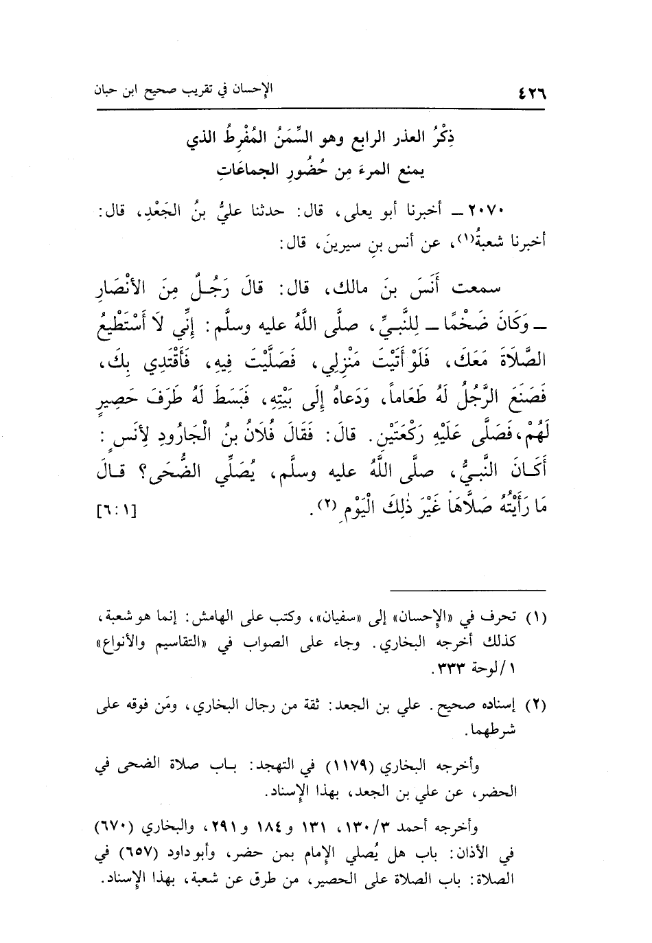1 تحرف في الإحسان إلى سفيان، وكتب على الهامش: إنما هو شعبة، كذلك أخرجه البخاري. وجاء على الصواب في التقاسيم والأنواع 1/لوحة333.
