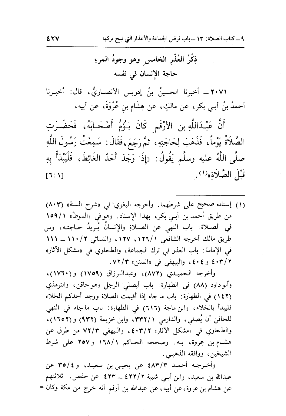 وأخرجه أحمد 3/483 عن يحيى بن سعيد، و4/35 عن عبد الله بن سعيد، وابن أبي شيبة 2/422 -423 عن حفص، ثلاثتهم عن هشام بن عروة، عن أبيه، عن عبد الله بن أرقم أنه خرج من مكة وكان يؤمهم ويؤذن ويقيم، فأقام يوماً الصلاة، فقال: ليصل بكم رجل منكم، فإني سمعت رسول الله صلى الله عليه وسلم يقول: "إذا أراد أحدكم أن يذهب إلى الخلاء وأقيمت الصلاة، فليذهب إلى الخلاء".