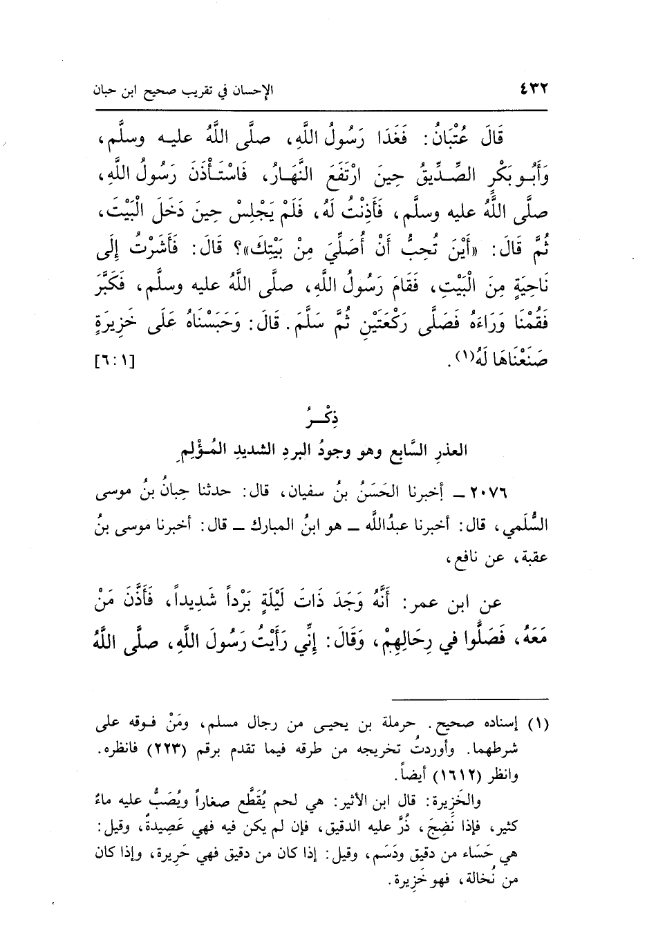 قَالَ عِتْبَانُ فَغَدَا رَسُولُ اللَّهِ صَلَّى اللَّهُ عَلَيْهِ وَسَلَّمَ وَأَبُو بَكْرٍ الصِّدِّيقُ حِينَ ارْتَفَعَ النَّهَارُ فَاسْتَأْذَنَ رَسُولُ اللَّهِ صَلَّى اللَّهُ عَلَيْهِ وَسَلَّمَ فَأَذِنْتُ لَهُ فَلَمْ يَجْلِسْ حِينَ دَخَلَ الْبَيْتَ ثُمَّ قَالَ: "أَيْنَ تُحِبُّ أَنْ أُصَلِّيَ مِنْ بَيْتِكَ؟ " قَالَ فَأَشَرْتُ إِلَى نَاحِيَةٍ مِنَ الْبَيْتِ فَقَامَ رَسُولُ اللَّهِ صَلَّى اللَّهُ عَلَيْهِ وَسَلَّمَ فَكَبَّرَ فَقُمْنَا وَرَاءَهُ فَصَلَّى رَكْعَتَيْنِ ثُمَّ سَلَّمَ قَالَ وَحَبَسْنَاهُ عَلَى خَزِيرَةٍ صَنَعْنَاهَا لَهُ 1. [1: 6]