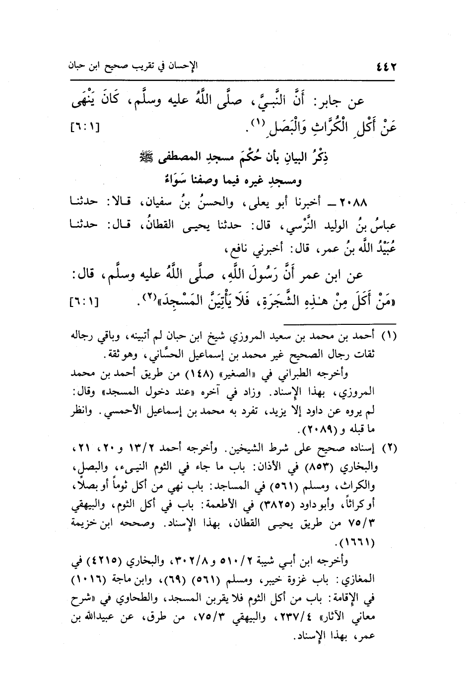 1 أحمد بن محمد بن سعيد المروزي شيخ ابن حبان مترجم في تاريخ بغداد 5/13، وهو معدود في جملة الثقات، وباقي رجاله ثقات رجال الصحيح غير محمد بن إسماعيل الحسَّاني، وهو ثقه.