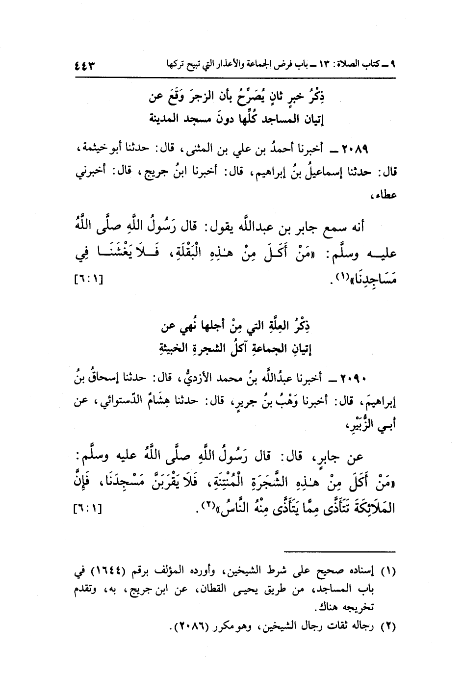 أَنَّهُ سَمِعَ جَابِرَ بْنَ عَبْدِ اللَّهِ يَقُولُ قَالَ رَسُولُ اللَّهِ صَلَّى اللَّهُ عَلَيْهِ وَسَلَّمَ: "مَنْ أَكَلَ مِنْ هذه البقلة فلا يغشنا في مساجدنا" 1. [1: 6]