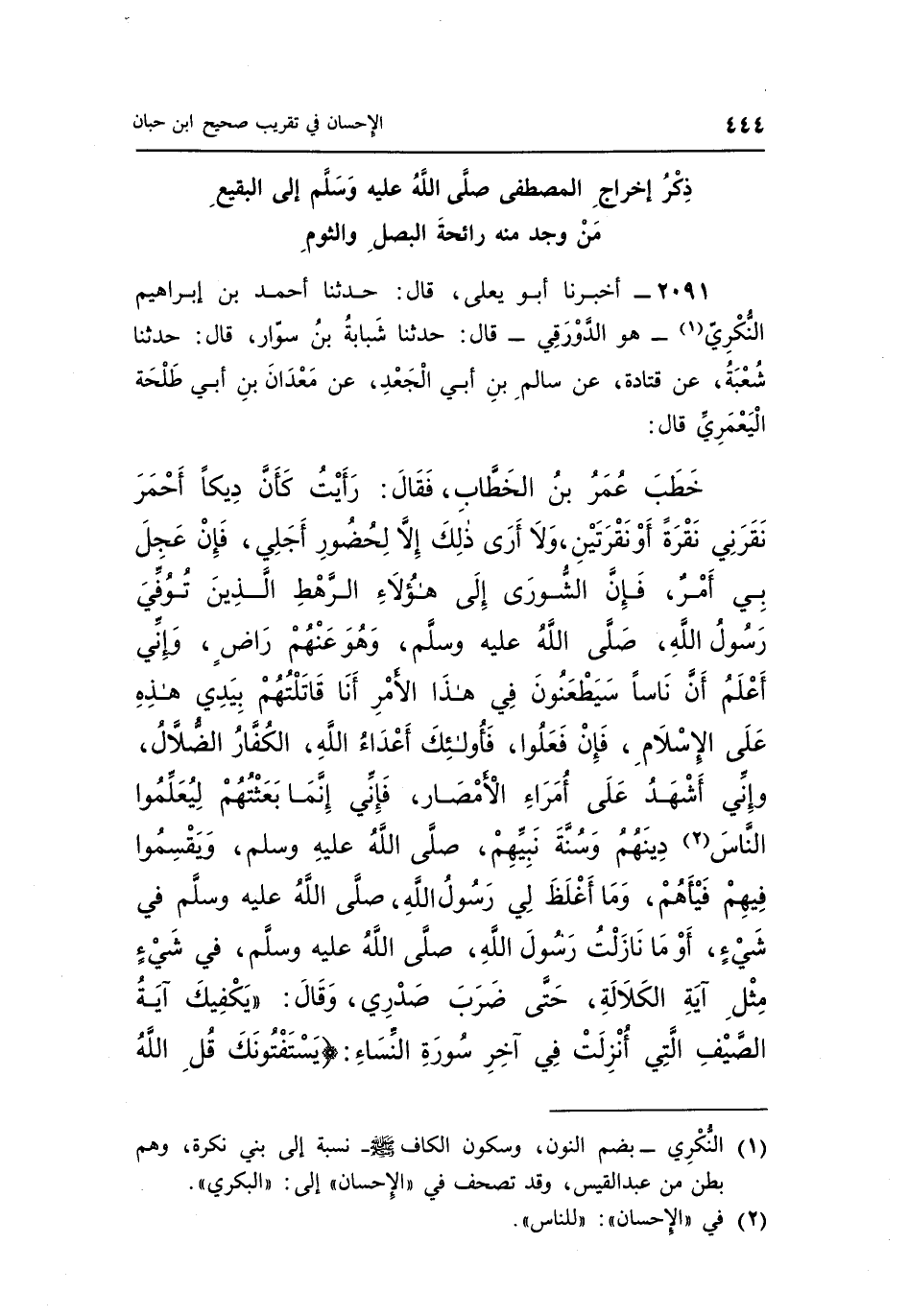 1 النكري – بضم النون، وسكون الكاف صلى الله عليه وسلم نسبة إلى بني نكرة، وهم بطن من عبد القيس، وقد تصحف في الإحسان إلى: البكري.