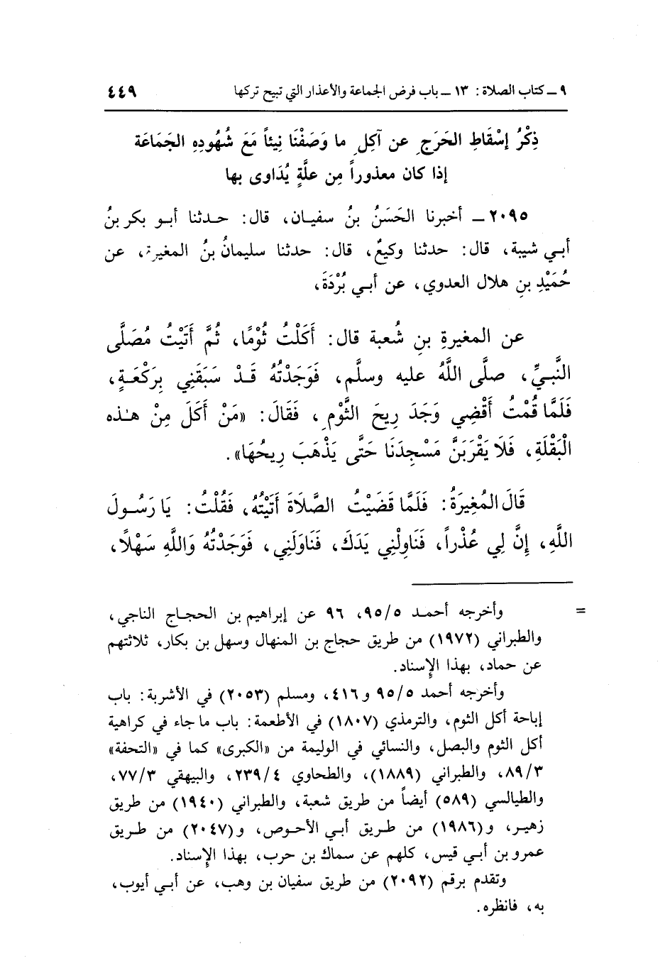 عَنِ الْمُغِيرَةِ بْنِ شُعْبَةَ قَالَ أَكَلْتُ ثُومًا ثُمَّ أَتَيْتُ مُصَلَّى النَّبِيِّ صَلَّى اللَّهُ عَلَيْهِ وَسَلَّمَ فَوَجَدْتُهُ قَدْ سَبَقَنِي بِرَكْعَةٍ فَلَمَّا قُمْتُ أَقْضِي وَجَدَ رِيحَ الثُّومِ فَقَالَ: "مَنْ أَكَلَ مِنْ هَذِهِ الْبَقْلَةِ فَلَا يَقْرَبَنَّ مَسْجِدَنَا حَتَّى يَذْهَبَ رِيحُهَا".