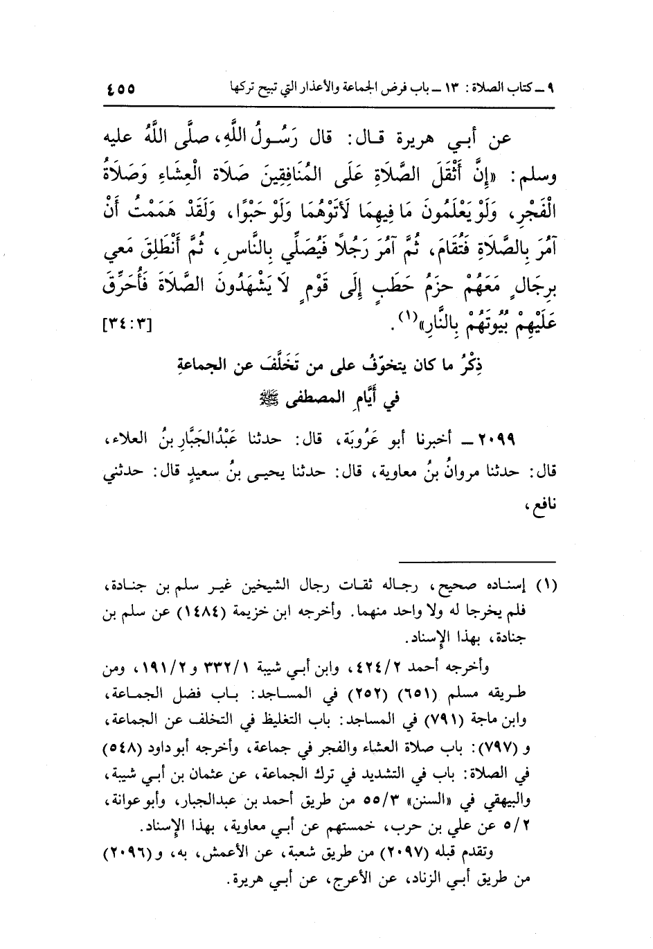 عَنْ أَبِي هُرَيْرَةَ قَالَ قَالَ رَسُولُ اللَّهِ صَلَّى اللَّهُ عَلَيْهِ وَسَلَّمَ: "إِنَّ أَثْقَلَ الصَّلَاةِ عَلَى الْمُنَافِقِينَ صَلَاةُ الْعِشَاءِ وَصَلَاةُ الْفَجْرِ وَلَوْ يَعْلَمُونَ مَا فِيهَا لَأَتَوْهُمَا وَلَوْ حَبْوًا وَلَقَدْ هَمَمْتُ أَنْ آمُرَ بِالصَّلَاةِ فَتُقَامَ ثُمَّ آمُرَ رَجُلًا فَيُصَلِّيَ بِالنَّاسِ ثُمَّ أَنْطَلِقَ مَعِي بِرِجَالٍ مَعَهُمْ حِزَمُ حَطَبٍ إِلَى قَوْمٍ لَا يَشْهَدُونَ الصلاة فأحرق عليهم بيوتهم بالنار" 1. [3: 50]