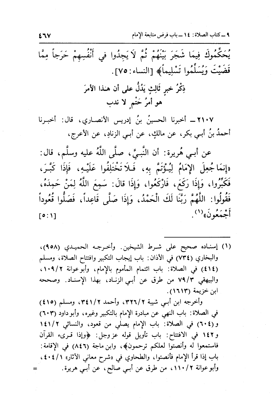 2107 - أَخْبَرَنَا الْحُسَيْنُ بْنُ إِدْرِيسَ الْأَنْصَارِيُّ قَالَ: أَخْبَرَنَا أَحْمَدُ بْنُ أَبِي بَكْرٍ عَنْ مَالِكٍ عَنْ أَبِي الزِّنَادِ عَنِ الْأَعْرَجِ،