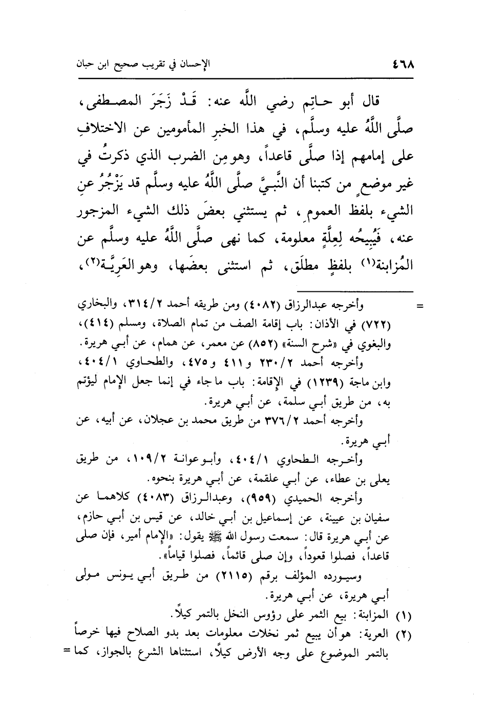 قال أبو حاتم رضى الله تعالى عَنْهُ: قَدْ زَجَرَ الْمُصْطَفَى صَلَّى اللَّهُ عَلَيْهِ وَسَلَّمَ فِي هَذَا الْخَبَرِ الْمَأْمُومِينَ عَنِ الِاخْتِلَافِ عَلَى إِمَامِهِمْ إِذَا صَلَّى قَاعِدًا وَهُوَ مِنَ ضرب الَّذِي ذَكَرْتُ فِي غَيْرِ مَوْضِعٍ مِنْ كُتُبِنَا أَنَّ النَّبِيَّ صَلَّى اللَّهُ عَلَيْهِ وَسَلَّمَ قَدْ يَزْجُرُ عَنِ الشَّيْءِ بِلَفْظِ الْعُمُومِ ثُمَّ يَسْتَثْنِي بَعْضَ ذَلِكَ الشَّيْءِ الْمَزْجُورِ عَنْهُ فَيُبِيحُهُ لِعِلَّةٍ مَعْلُومَةٍ كَمَا نَهَى صَلَّى اللَّهُ عَلَيْهِ وَسَلَّمَ عَنِ الْمُزَابَنَةِ 1 بِلَفْظٍ مُطْلَقٍ ثُمَّ اسْتَثْنَى بَعْضَهَا وهو العرية 2،