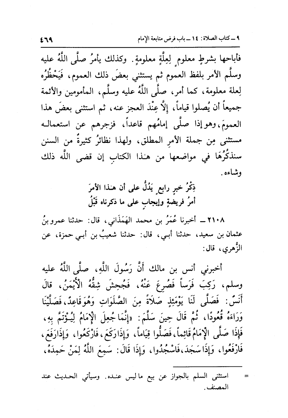 فَأَبَاحَهَا بِشَرْطٍ مَعْلُومٍ لِعِلَّةٍ مَعْلُومَةٍ وَكَذَلِكَ يَأْمُرُ صَلَّى اللَّهُ عَلَيْهِ وَسَلَّمَ الْأَمْرَ بِلَفْظِ الْعُمُومِ ثُمَّ يَسْتَثْنِي بَعْضَ ذَلِكَ الْعُمُومِ فَيَحْظُرُهُ لِعِلَّةٍ مَعْلُومَةٍ كَمَا أَمَرَ صَلَّى اللَّهُ عَلَيْهِ وَسَلَّمَ الْمَأْمُومِينَ وَالْأَئِمَّةَ جَمِيعًا أَنْ يُصَلُّوا قِيَامًا إِلَّا عِنْدَ الْعَجْزِ عَنْهُ ثُمَّ اسْتَثْنَى بَعْضَ هَذَا الْعُمُومِ وَهُوَ إِذَا صَلَّى إِمَامُهُمْ قَاعِدًا فَزَجَرَهُمْ عَنِ اسْتِعْمَالِهِ مَسْتَثْنًى مِنْ جُمْلَةِ الْأَمْرِ الْمُطْلَقِ وَلِهَذَا نَظَائِرُ كَثِيرَةٌ مِنَ السُّنَنِ سَنَذْكُرُهَا فِي مَوَاضِعِهَا مِنْ هَذَا الْكِتَابِ إِنْ قَضَى اللَّهُ ذَلِكَ وشاءه.
