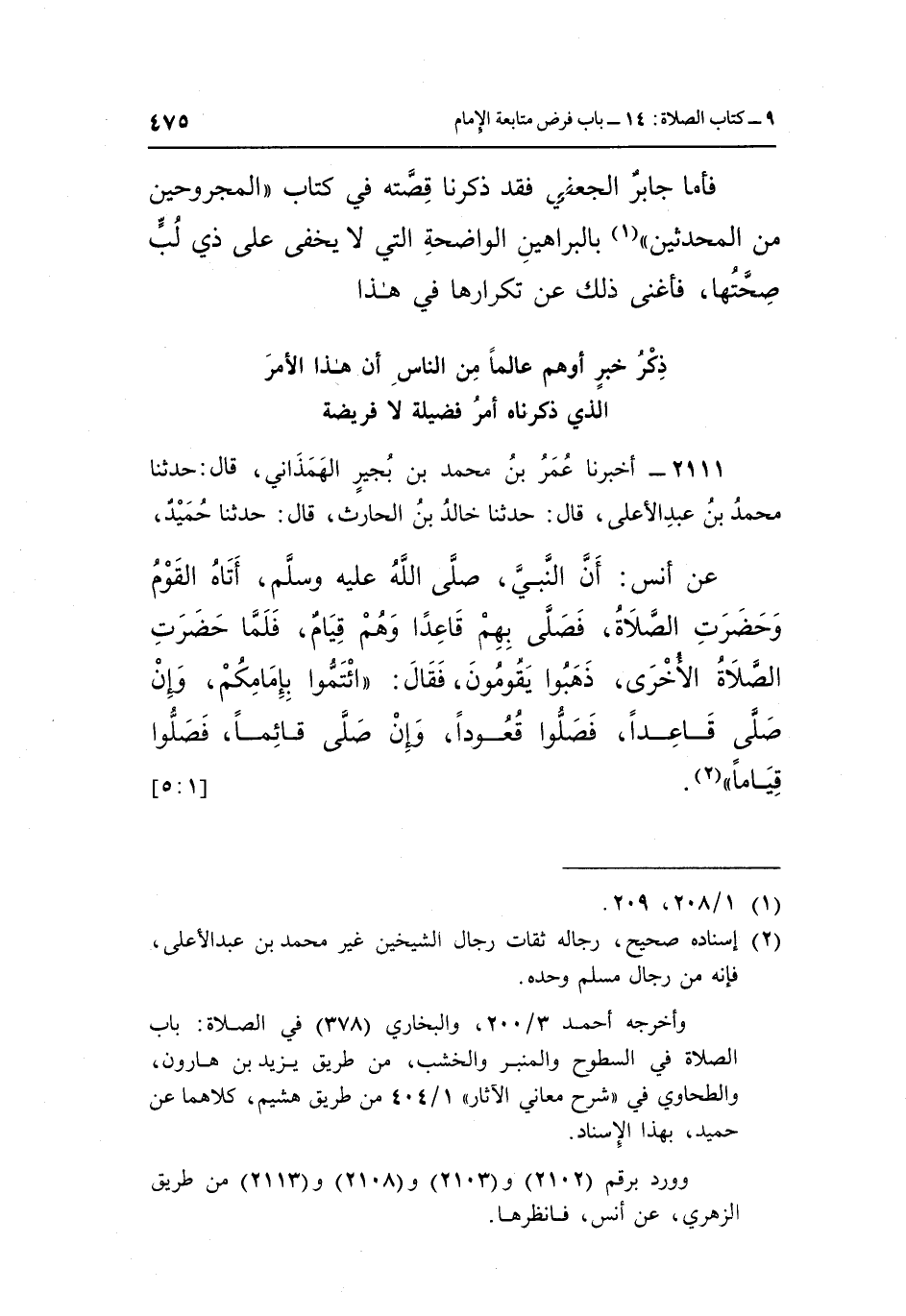 عَنْ أَنَسٍ أَنَّ النَّبِيَّ صَلَّى اللَّهُ عَلَيْهِ وَسَلَّمَ أَتَاهُ الْقَوْمُ وَحَضَرَتِ الصَّلَاةُ فَصَلَّى بِهِمْ قَاعِدًا وَهُمْ قِيَامٌ فَلَمَّا حَضَرَتِ الصَّلَاةُ الْأُخْرَى ذَهَبُوا يَقُومُونَ فَقَالَ: "ائْتَمُّوا بِإِمَامِكُمْ وَإِنْ صَلَّى قَاعِدًا فَصَلُّوا قُعُودًا وَإِنْ صَلَّى قَائِمًا فصلوا قياما" 2. [1: 5]