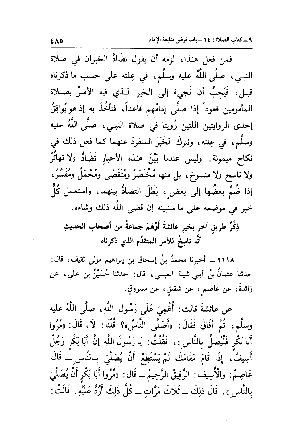 فَمَنْ فَعَلَ هَذَا لَزِمَهُ أَنْ يَقُولَ تَضَادَّ الْخَبَرَانِ فِي صَلَاةِ النَّبِيِّ صَلَّى اللَّهُ عَلَيْهِ وَسَلَّمَ فِي عِلَّتِهِ عَلَى حَسْبِ مَا ذَكَرْنَاهُ قَبْلُ فَيَجِبُ أَنْ نَجِيءَ إِلَى الْخَبَرِ الَّذِي فِيهِ الْأَمْرُ بِصَلَاةِ الْمَأْمُومِينَ قُعُودًا إِذَا صَلَّى إِمَامُهُمْ قَاعِدًا فَنَأْخُذُ بِهِ إِذْ هُوَ يُوَافِقُ إِحْدَى الرِّوَايَتَيْنِ اللَّتَيْنِ رُوِيَتَا فِي صَلَاةِ النَّبِيِّ صَلَّى اللَّهُ عَلَيْهِ وَسَلَّمَ فِي عِلَّتِهِ وَنَتْرُكَ الْخَبَرَ الْمُنْفَرِدَ عَنهُمَا كَمَا فَعَلَ ذَلِكَ فِي نِكَاحِ مَيْمُونَةَ وَلَيْسَ عِنْدَنَا بَيْنَ هَذِهِ الْأَخْبَارِ تَضَادٌّ وَلَا تَهَاتُرٌ وَلَا نَاسِخٌ وَلَا مَنْسُوخٌ بَلْ مِنْهَا مُخْتَصَرٌ وَمُتَقَصًّى وَمُجْمَلٌ وَمُفَسَّرٌ إِذَا ضُمَّ بَعْضُهَا إِلَى بَعْضٍ بَطَلَ التَّضَادُّ بَيْنَهُمَا وَاسْتُعْمِلَ كُلُّ خَبَرٍ فِي مَوْضِعِهِ عَلَى مَا سنبينه إن قضى الله ذلك وشاءه.