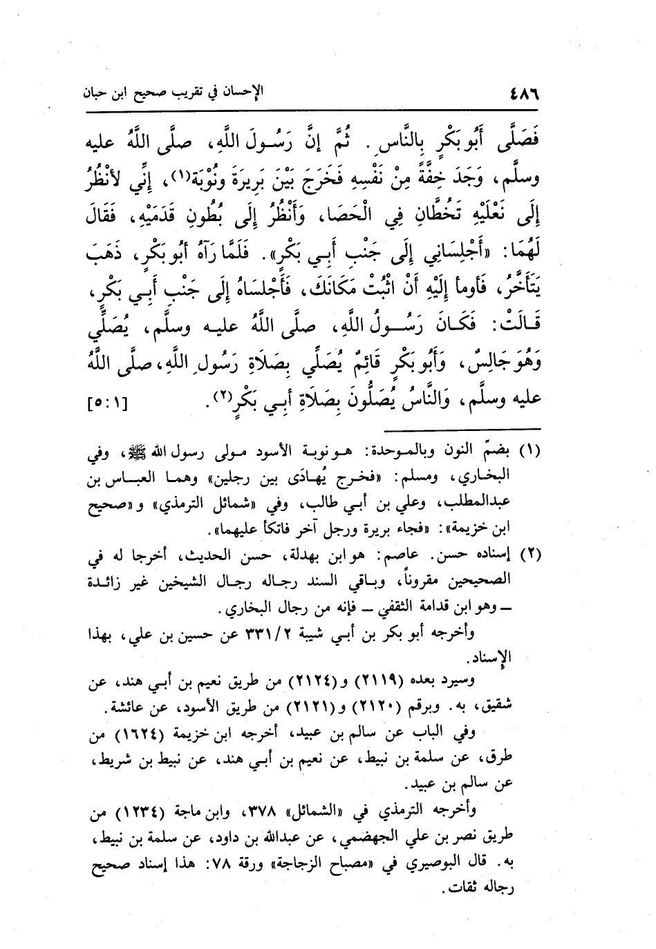 فَصَلَّى أَبُو بَكْرٍ بِالنَّاسِ ثُمَّ إِنَّ رَسُولَ اللَّهِ صَلَّى اللَّهُ عَلَيْهِ وَسَلَّمَ وَجَدَ خِفَّةً مِنْ نَفْسِهِ فَخَرَجَ بَيْنَ بَرِيرَةَ وَنُوبَةَ 1 إِنِّي لَأَنْظُرُ إِلَى نَعْلَيْهِ تَخُطَّانِ فِي الْحَصَا وَأَنْظُرُ إِلَى بُطُونِ قَدَمَيْهِ فَقَالَ لَهُمَا: "أَجْلِسَانِي إِلَى جَنْبِ أَبِي بَكْرٍ". فَلَمَّا رَآهُ أَبُو بَكْرٍ ذَهَبَ يَتَأَخَّرُ فَأَوْمَأَ إِلَيْهِ أَنِ اثْبُتْ مَكَانَكَ فَأَجْلَسَاهُ إِلَى جَنْبِ أَبِي بَكْرٍ قَالَتْ فَكَانَ رَسُولُ اللَّهِ صَلَّى اللَّهُ عَلَيْهِ وَسَلَّمَ يُصَلِّي وَهُوَ جَالِسٌ وَأَبُو بَكْرٍ قَائِمٌ يُصَلِّي بِصَلَاةِ رَسُولِ اللَّهِ صَلَّى اللَّهُ عَلَيْهِ وَسَلَّمَ وَالنَّاسَ يصلون بصلاة أبي بكر 2. [1: 5]