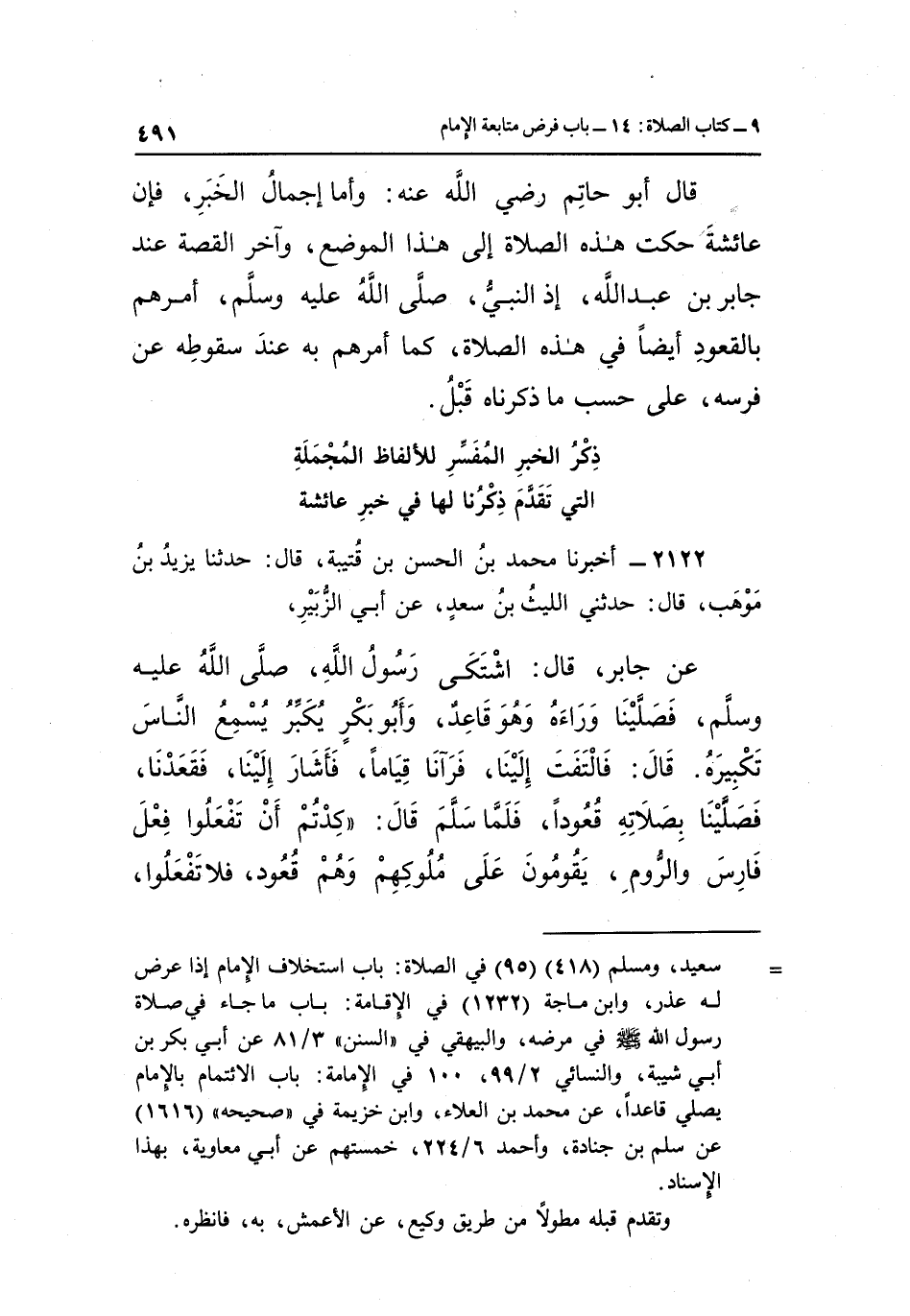 قال أبو حاتم رضى الله تعالى عَنْهُ: وَأَمَّا إِجْمَالُ الْخَبَرِ فَإِنَّ عَائِشَةَ حَكَتْ هَذِهِ الصَّلَاةَ إِلَى هَذَا الْمَوْضِعِ وَآخِرُ الْقِصَّةِ عِنْدَ جَابِرِ بْنِ عَبْدِ اللَّهِ إِذِ النَّبِيُّ صَلَّى اللَّهُ عَلَيْهِ وَسَلَّمَ أَمَرَهُمْ بِالْقُعُودِ أَيْضًا فِي هَذِهِ الصَّلَاةِ كَمَا أَمَرَهُمْ بِهِ عِنْدَ سُقُوطِهِ عَنِ فَرَسِهِ عَلَى حَسْبِ مَا ذَكَرْنَاهُ قبل.