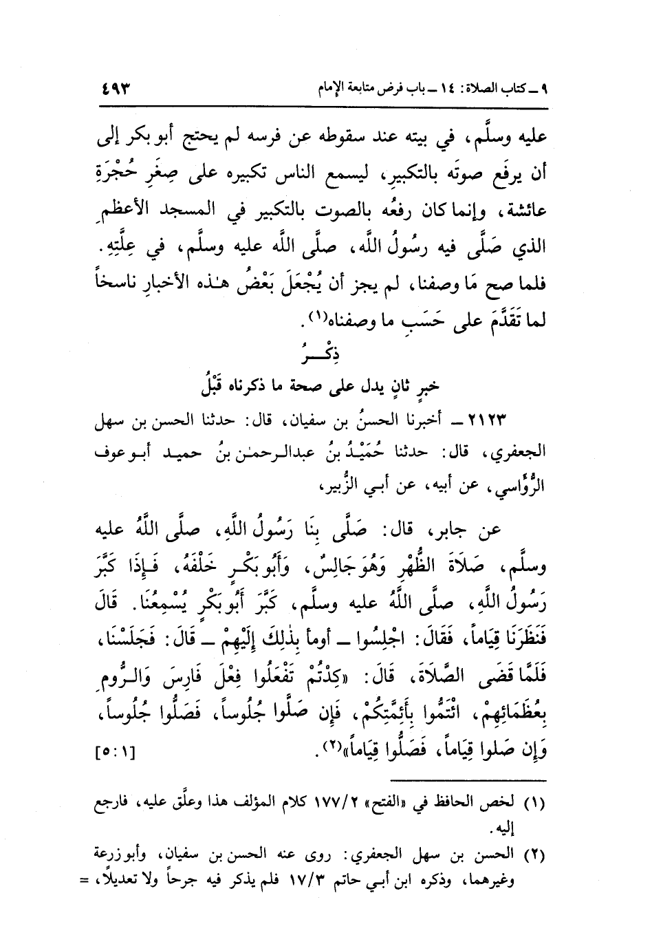 عَلَيْهِ وَسَلَّمَ فِي بَيْتِهِ عِنْدَ سُقُوطِهِ عَنْ فَرَسِهِ لَمْ يَحْتَجْ أَبُو بَكْرٍ إِلَى أَنْ يَرْفَعَ صَوْتَهُ بِالتَّكْبِيرِ لَيُسْمِعَ النَّاسَ تَكْبِيرَهُ عَلَى صِغَرُ حُجْرَةُ عَائِشَةَ وَإِنَّمَا رَفْعُهُ بِالصَّوْتِ بِالتَّكْبِيرِ فِي الْمَسْجِدِ الْأَعْظَمِ الَّذِي صَلَّى فِيهِ رَسُولُ اللَّهِ صَلَّى اللَّهُ عَلَيْهِ وَسَلَّمَ فِي عِلَّتِهِ فَلَمَّا صَحَّ مَا وَصَفْنَا لَمْ يَجُزْ أَنْ يُجْعَلَ بَعْضُ هَذِهِ الْأَخْبَارِ نَاسِخًا لِمَا تَقَدَّمَ على حسب ما وصفناه 1.