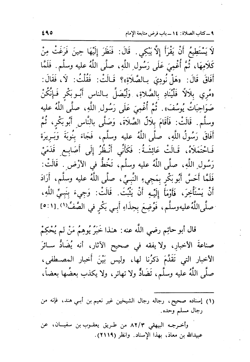 قال أبو حاتم رضى الله تعالى عَنْهُ: هَذَا خَبَرٌ يُوهِمُ مَنْ لَمْ يُحْكِمْ صِنَاعَةِ الْأَخْبَارِ وَلَا يَفْقَهُ فِي صَحِيحِ الْآثَارِ أَنَّهُ يُضَادُّ سَائِرَ الْأَخْبَارِ الَّتِي تَقَدَّمَ ذِكْرُنَا لَهَا وَلَيْسَ بَيْنَ أَخْبَارِ الْمُصْطَفَى صَلَّى اللَّهُ عَلَيْهِ وَسَلَّمَ تَضَادٌّ وَلَا تَهَاتُرٌ وَلَا يُكَذِّبُ بعضها بعضا،