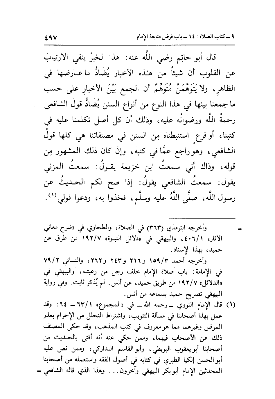 قال أبو حاتم رضى الله تعالى عَنْهُ: هَذَا الْخَبَرُ يَنْفِي الِارْتِيَابَ عَنِ الْقُلُوبِ أَنَّ شَيْئًا مِنْ هَذِهِ الْأَخْبَارِ يُضَادُّ مَا عَارَضَهَا فِي الظَّاهِرِ وَلَا يَتَوَهَّمَنَّ مُتَوَهِّمٌ أَنَّ الْجَمْعَ بَيْنَ الْأَخْبَارِ عَلَى حَسْبِ مَا جَمَعْنَا بَيْنَهَا فِي هَذَا النَّوْعِ مِنْ أَنْوَاعِ السُّنَنِ يُضَادُّ قَوْلَ الشَّافِعِيِّ رَحْمَةُ اللَّهِ وَرِضْوَانُهُ عَلَيْهِ وَذَلِكَ أَنَّ كُلَّ أَصْلٍ تَكَلَّمْنَا عَلَيْهِ فِي كتبنا أو فرع استنبطاه مِنَ السُّنَنِ فِي مُصَنَّفَاتِنَا هِيَ كُلُّهَا قَوْلُ الشَّافِعِيِّ وَهُوَ رَاجِعٌ عَمَّا فِي كُتُبِهِ وَإِنْ كَانَ ذَلِكَ الْمَشْهُورَ مِنْ قَوْلِهِ وَذَاكَ أَنِّي سمعت بن خُزَيْمَةَ يَقُولُ سَمِعْتُ الْمُزَنِيَّ يَقُولُ سَمِعْتُ الشَّافِعِيَّ يَقُولُ إِذَا صَحَّ لَكُمُ الْحَدِيثُ عَنْ رَسُولِ اللَّهِ صَلَّى اللَّهُ عَلَيْهِ وَسَلَّمَ فَخُذُوا بِهِ ودعوا قولي 1.