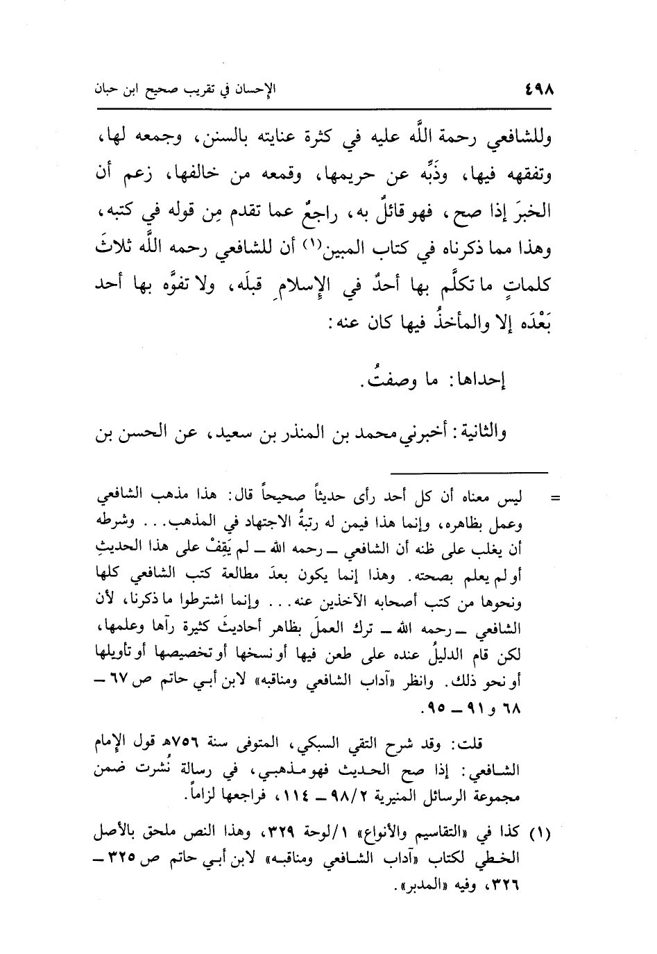 وَللِشَّافِعِيِّ رَحْمَةُ اللَّهِ عَلَيْهِ فِي كَثْرَةِ عِنَايَتِهِ بِالسُّنَنِ وَجَمْعِهِ لَهَا وَتَفَقُّهِهِ فِيهَا وَذَبِّهِ عَنْ حَرِيمِهَا وَقَمْعِهِ مَنْ خَالَفَهَا زَعَمَ أَنَّ الْخَبَرَ إِذَا صَحَّ فَهُوَ قَائِلٌ بِهِ رَاجِعٌ عَمَّا تَقَدَّمَ مِنْ قَوْلِهِ فِي كُتُبِهِ وَهَذَا مِمَّا ذَكَرْنَاهُ فِي كِتَابِ الْمُبَيِّنِ 1 أَنَّ لِلشَّافِعِيِّ رَحِمَهُ اللَّهُ ثَلَاثُ كَلِمَاتٍ مَا تَكَلَّمُ بِهَا أَحَدٌ فِي الْإِسْلَامِ قَبْلَهُ وَلَا تَفَوَّهَ بِهَا أَحَدٌ بَعْدَهُ إِلَّا وَالْمَأْخَذُ فِيهَا كَانَ عَنْهُ: