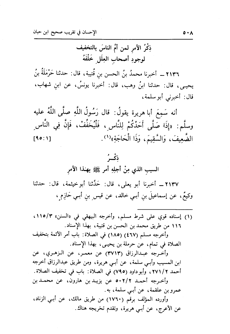 أَنَّهُ سَمِعَ أَبَا هُرَيْرَةَ يَقُولُ: قَالَ رَسُولُ اللَّهِ صَلَّى اللَّهُ عَلَيْهِ وَسَلَّمَ: "إِذَا صَلَّى أحدكم للناس، فَلْيُخَفِّفْ فَإِنَّ فِي النَّاسِ الضَّعِيفَ، وَالسَّقِيمَ، وَذَا الحاجة" 1. [1: 95]