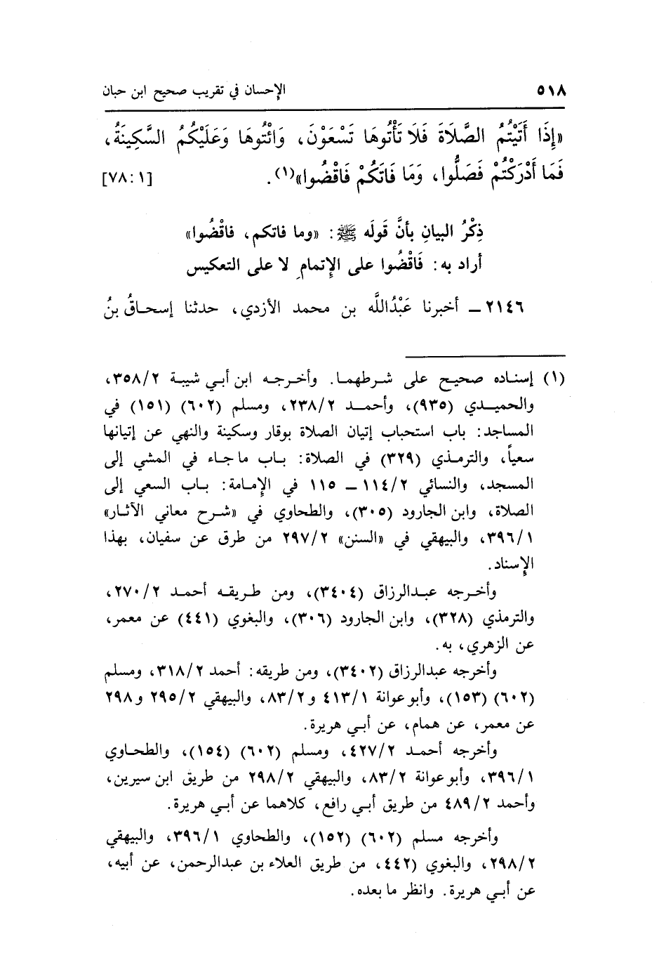 "إِذَا أَتَيْتُمُ الصَّلَاةَ فَلَا تَأْتُوهَا تَسْعَوْنَ، وَائْتُوهَا وَعَلَيْكُمُ السَّكِينَةُ، فَمَا أَدْرَكْتُمْ فَصَلُّوا، وَمَا فَاتَكُمْ فاقضوا" 1. [1: 78]
