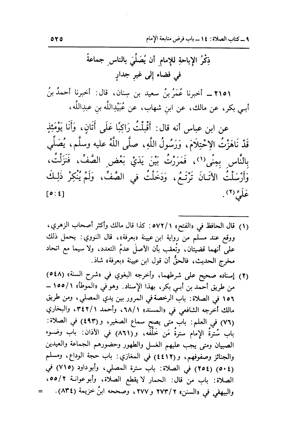 عَنِ ابْنِ عَبَّاسٍ أَنَّهُ قَالَ: أَقْبَلْتُ رَاكِبًا عَلَى أَتَانٍ، وَأَنَا يَوْمَئِذٍ قَدْ نَاهَزْتُ الِاحْتِلَامَ، وَرَسُولُ اللَّهِ صَلَّى اللَّهُ عَلَيْهِ وَسَلَّمَ، يُصَلِّي بِالنَّاسِ بِمِنًى1، فَمَرَرْتُ بَيْنَ يَدَيْ بَعْضِ الصَّفِّ، فَنَزَلْتُ، وَأَرْسَلْتُ الْأَتَانَ تَرْتَعُ، وَدَخَلْتُ فِي الصَّفِّ، وَلَمْ يُنْكِرْ ذَلِكَ علي2. [4: 5]