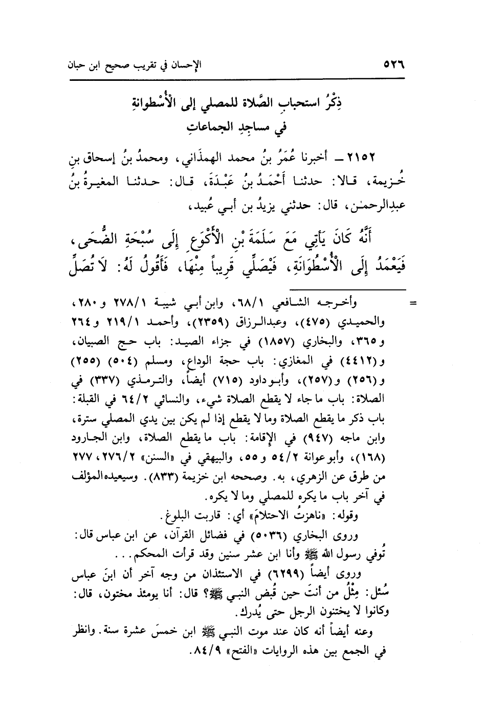 أَنَّهُ كَانَ يَأْتِي مَعَ سَلَمَةَ بْنِ الْأَكْوَعِ إِلَى سُبْحَةِ الضُّحَى، فَيَعْمِدُ إِلَى الْأُسْطُوَانَةِ، فَيُصَلِّي قَرِيبًا مِنْهَا، فَأَقُولُ لَهُ: لَا تُصَلِّ