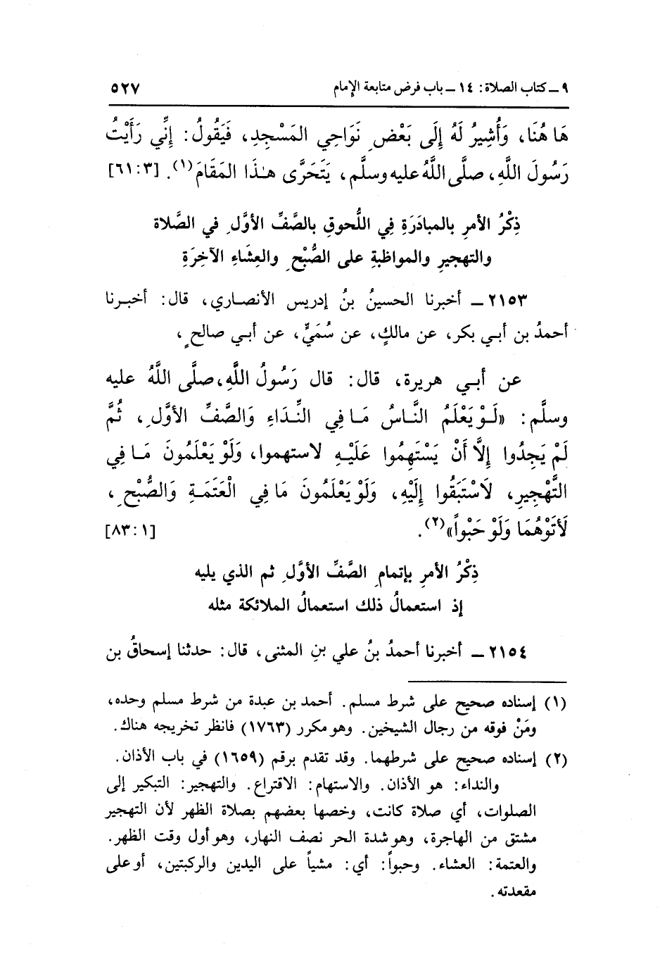 عَنْ أَبِي هُرَيْرَةَ، قَالَ: قَالَ رَسُولُ اللَّهِ صَلَّى اللَّهُ عَلَيْهِ وَسَلَّمَ: "لَوْ يَعْلَمُ النَّاسُ مَا فِي النِّدَاءِ وَالصَّفِّ الْأَوَّلِ، ثُمَّ لَمْ يَجِدُوا إِلَّا أَنْ يَسْتَهِمُوا عَلَيْهِ لَاسْتَهَمُوا، وَلَوْ يَعْلَمُونَ مَا فِي التَّهْجِيرِ، لَاسْتَبَقُوا إِلَيْهِ، وَلَوْ يَعْلَمُونَ مَا فِي الْعَتَمَةِ وَالصُّبْحِ، لَأَتَوْهُمَا ولو حبوا" 2. [1: 83]