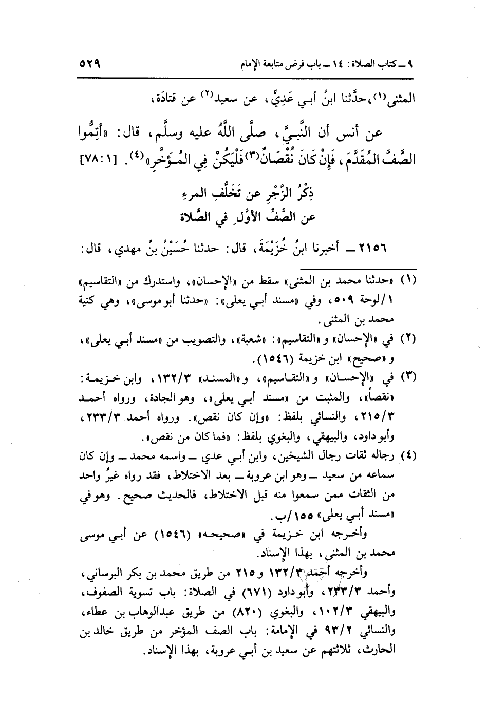 عَنْ أَنَسٍ أَنَّ النَّبِيَّ صَلَّى اللَّهُ عَلَيْهِ وَسَلَّمَ، قَالَ: "أَتِمُّوا الصَّفَّ الْمُقَدَّمَ، فَإِنْ كَانَ نُقْصَانٌ3 فليكن في المؤخرة" 4. [1: 78]
