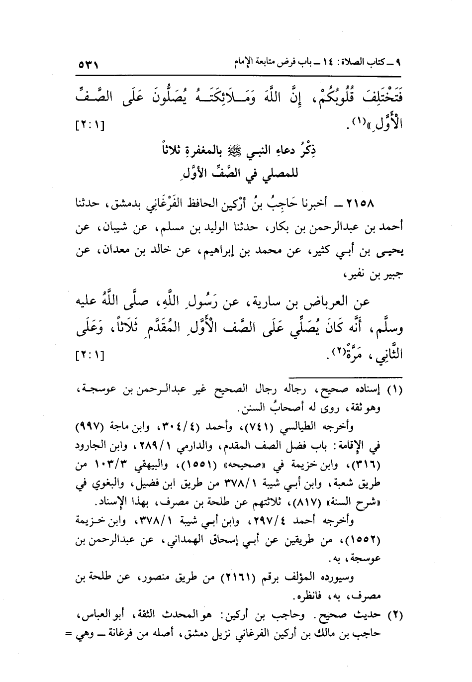 2 حديث صحيح. وحاجب بن أركين: هو المحدث الثقة، أبو العباس، حاجب بن مالك الفرغاني نزيل دمشق، أصله من فرغانة -وهي =