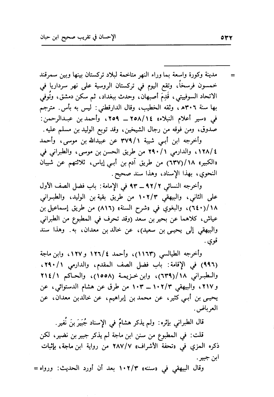 = مدينة وكورة واسعة بما وراء النهر متاخمة لبلاد تركستان بينها وبين سمرقند خمسون فرسخا، وتقع اليوم في تركستان الروسية على نهر سرداريا في الاتحاد السوفيتي، قدم أصبهان، وحدث ببغداد، ثم سكن دمشق، وتوفي بها سنة 306 هـ، وثقه الخطيب، وقال الدارقطني: ليس به بأس. مترجم في "سير أعلام النبلاء" 14/258-259، وأحمد بن عبد الرحمن: صدوق، ومن فوقه من رجال الشيخين، وقد توبع الوليد بن مسلم عليه.