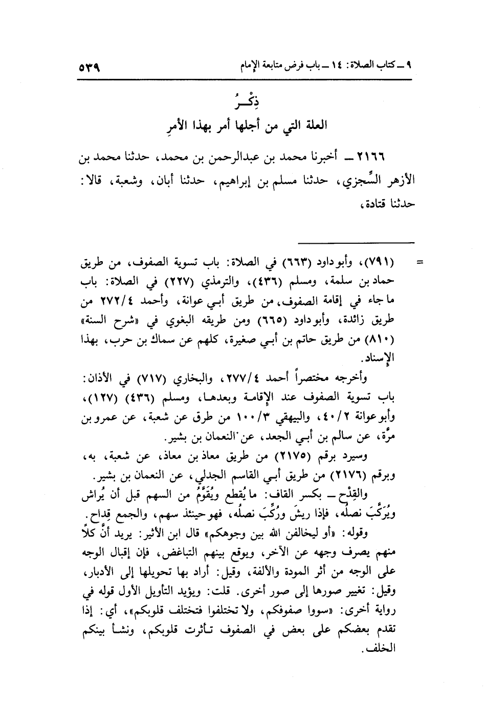 = "791"، وأبو داود "663" في الصلاة: باب تسوية الصفوف، من طريق حماد بن سلمة، ومسلم "436"، والترمذي "227" في الصلاة: باب ما جاء في إقامة الصفوف من طريق أبي عوانة، وأحمد 4/272 من طريق زائدة، وأبو داود "665" ومن طريقه البغوي في "شرح السنة" "810" من طريق حاتم بن أبي صغيرة، كلهم عن سماك بن حرب، بهذا الإٍسناد.