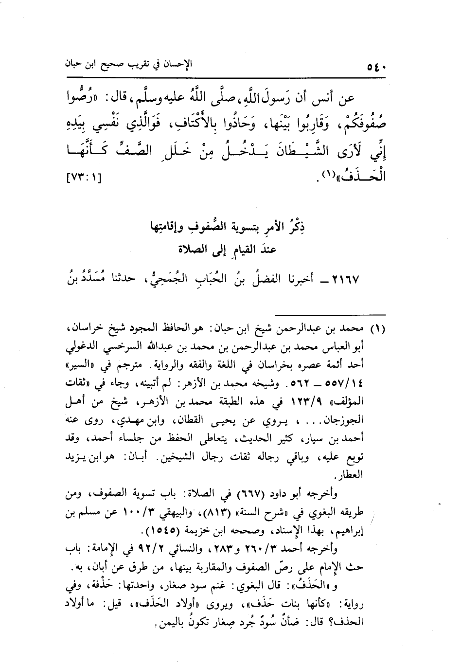 عَنْ أَنَسٍ أَنَّ رَسُولَ اللَّهِ صَلَّى اللَّهُ عَلَيْهِ وَسَلَّمَ، قَالَ: "رُصُّوا صُفُوفَكُمْ، وَقَارِبُوا بَيْنَهَا، وحاذوا بالأكتاف، فو الذي نَفْسِي بِيَدِهِ إِنِّي لَأَرَى الشَّيْطَانَ يَدْخُلُ مِنْ خلل الصف كأنها الحذف" 1. [1: 73]