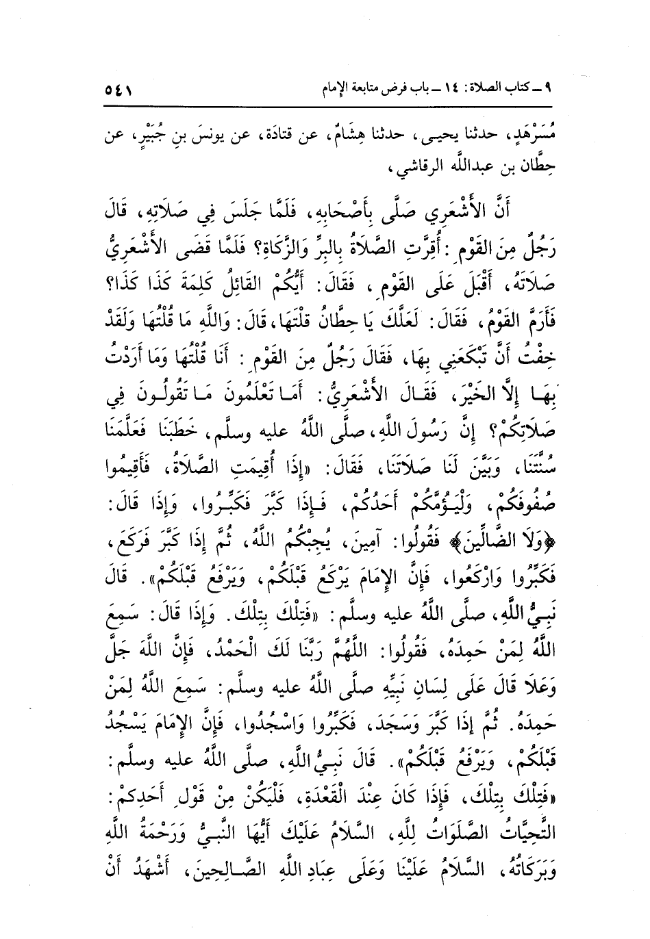 أَنَّ الْأَشْعَرِيَّ صَلَّى بِأَصْحَابِهِ، فَلَمَّا جَلَسَ فِي صَلَاتِهِ، قَالَ رَجُلٌ مِنَ الْقَوْمِ: أُقِرَّتِ الصَّلَاةُ بِالْبِرِّ وَالزَّكَاةِ؟ فَلَمَّا قَضَى الْأَشْعَرِيُّ صَلَاتَهُ، أَقْبَلَ عَلَى الْقَوْمِ، فَقَالَ: أَيُّكُمُ الْقَائِلُ كَلِمَةَ كَذَا كَذَا؟ فَأَرَمَّ الْقَوْمُ، فَقَالَ: لَعَلَّكَ يَا حِطَّانُ قُلْتُهَا، قَالَ: وَاللَّهِ مَا قُلْتُهَا وَلَقَدْ خِفْتُ أَنْ تَبْكَعَنِي بِهَا، فَقَالَ رَجُلٌ مِنَ الْقَوْمِ: أَنَا قُلْتُهَا وَمَا أَرَدْتُ بِهَا إِلَّا الْخَيْرَ، فَقَالَ الْأَشْعَرِيُّ: أَمَا تَعْلَمُونَ مَا تَقُولُونَ فِي صَلَاتِكُمْ؟ إِنَّ رَسُولَ اللَّهِ صَلَّى اللَّهُ عَلَيْهِ وَسَلَّمَ، خَطَبَنَا فَعَلَّمَنَا سُنَّتَنَا، وَبَيَّنَ لَنَا صَلَاتَنَا، فَقَالَ: "إِذَا أُقِيمَتِ الصَّلَاةُ، فَأَقِيمُوا صُفُوفَكُمْ، وَلْيَؤُمَّكُمْ أَحَدُكُمْ، فَإِذَا كَبَّرَ فَكَبِّرُوا، وإذا قال: {وَلا الضَّالِّينَ} فَقُولُوا: آمِينَ، يُجِبْكُمُ اللَّهُ، ثُمَّ إِذَا كَبَّرَ فَرَكَعَ، فَكَبِّرُوا وَارْكَعُوا، فَإِنَّ الْإِمَامَ يَرْكَعُ قَبْلَكُمْ، وَيَرْفَعُ قَبْلَكُمْ". قَالَ نَبِيُّ اللَّهِ صَلَّى اللَّهُ عَلَيْهِ وَسَلَّمَ: "فَتِلْكَ بِتِلْكَ. وَإِذَا قَالَ: سَمِعَ اللَّهُ لِمَنْ حَمِدَهُ، فَقُولُوا: اللَّهُمَّ رَبَّنَا لَكَ الْحَمْدُ، فَإِنَّ اللَّهَ جَلَّ وَعَلَا قَالَ عَلَى لِسَانِ نَبِيِّهِ صَلَّى اللَّهُ عَلَيْهِ وَسَلَّمَ: سَمِعَ اللَّهُ لِمَنْ حَمِدَهُ. ثُمَّ إِذَا كَبَّرَ وَسَجَدَ، فَكَبِّرُوا وَاسْجُدُوا، فَإِنَّ الْإِمَامَ يَسْجُدُ قَبْلَكُمْ، وَيَرْفَعُ قَبْلَكُمْ". قَالَ نَبِيُّ اللَّهِ صَلَّى اللَّهُ عَلَيْهِ وَسَلَّمَ: "فَتِلْكَ بِتِلْكَ، فَإِذَا كَانَ عِنْدَ الْقَعْدَةِ، فَلْيَكُنْ مِنْ قَوْلِ أَحَدِكُمُ: التَّحِيَّاتُ الصَّلَوَاتُ لِلَّهِ، السَّلَامُ عَلَيْكَ أَيُّهَا النَّبِيُّ وَرَحْمَةُ اللَّهِ وَبَرَكَاتُهُ، السَّلَامُ عَلَيْنَا وَعَلَى عِبَادِ اللَّهِ الصَّالِحِينَ، أَشْهَدُ أن