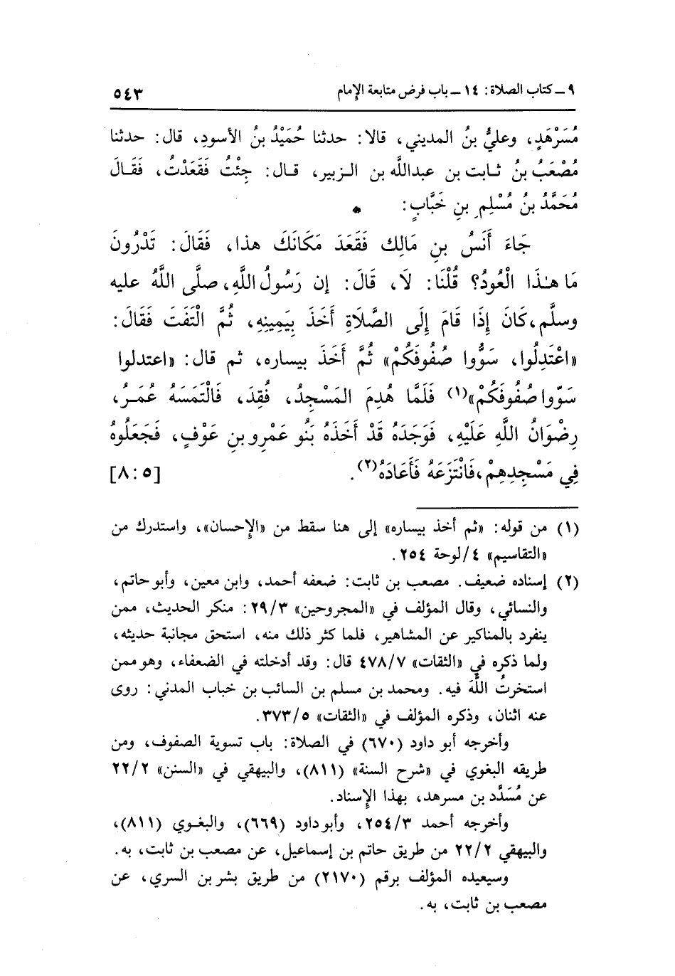 جَاءَ أَنَسُ بْنُ مَالِكٍ فَقَعَدَ مَكَانَكَ هَذَا، فَقَالَ: تَدْرُونَ مَا هَذَا الْعُودُ؟ قُلْنَا: لَا، قَالَ: إِنَّ رَسُولَ اللَّهِ صَلَّى اللَّهُ عَلَيْهِ وَسَلَّمَ، كَانَ إِذَا قَامَ إِلَى الصَّلَاةِ أَخَذَ بِيَمِينِهِ، ثُمَّ الْتَفَتَ فَقَالَ: "اعْتَدِلُوا، سَوُّوا صُفُوفَكُمْ" ثُمَّ أَخَذَ بِيَسَارِهِ، ثُمَّ قَالَ: "اعْتَدِلُوا، سَوُّوا صُفُوفَكُمْ" 1 فَلَمَّا هُدِمَ الْمَسْجِدُ، فُقِدَ، فَالْتَمَسَهُ عُمَرُ، رِضْوَانُ اللَّهِ عَلَيْهِ، فَوَجَدَهُ قَدْ أَخَذَهُ بَنُو عَمْرِو بْنِ عَوْفٍ، فَجَعَلُوهُ فِي مَسْجِدِهِمْ، فَانْتَزَعَهُ فأعاده2. [5: 8]