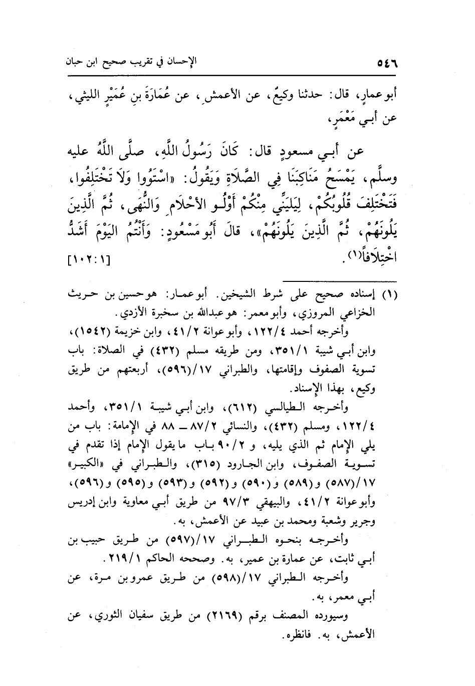 عَنْ أَبِي مَسْعُودٍ قَالَ: كَانَ رَسُولُ اللَّهِ صَلَّى اللَّهُ عَلَيْهِ وَسَلَّمَ، يَمْسَحُ مَنَاكِبَنَا فِي الصَّلَاةِ وَيَقُولُ: "اسْتَوُوا وَلَا تَخْتَلِفُوا، فَتَخْتَلِفَ قُلُوبُكُمْ، لِيَلِيَنِّي مِنْكُمْ أُولُو الْأَحْلَامِ وَالنُّهَى، ثُمَّ الَّذِينَ يَلُونَهُمْ، ثُمَّ الَّذِينَ يَلُونَهُمْ"، قَالَ أَبُو مسعود: وأنتم اليوم أشد اختلافا1. [1: 102]