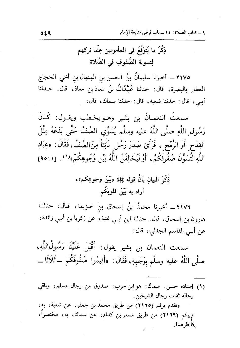 سَمِعْتُ النُّعْمَانَ بْنَ بَشِيرٍ وَهُوَ يَخْطُبُ وَيَقُولُ: كَانَ رَسُولُ اللَّهِ صَلَّى اللَّهُ عَلَيْهِ وَسَلَّمَ يُسَوِّي الصَّفَّ حَتَّى يَدَعَهُ مِثْلَ الْقِدْحِ أَوِ الرُّمْحِ، فَرَأَى صَدْرَ رَجُلٍ نَاتِئًا مِنَ الصَّفِّ، فَقَالَ:" عِبَادَ اللَّهِ لَتُسَوُّنَّ صُفُوفَكُمْ، أَوْ لَيُخَالِفَنَّ اللَّهُ بَيْنَ وجوهكم"1. [1: 95]
