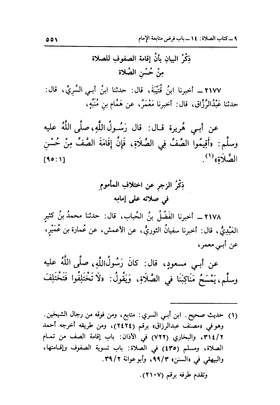 1 حديث صحيح. ابن أبي السري: متابع، ومن فوقه من رجال الشيخين. وهو في "مصنف عبد الرزاق" برقم "2424"، ومن طريقه أخرجه أحمد 2/314، والبخاري "722" في الأذان: باب إقامة الصف من تمام الصلاة، ومسلم "435" في الصلاة: باب تسوية الصفوف وإقامتها، والبيهقي في "السنن" 3/99، وأبو عوانة 2/39.