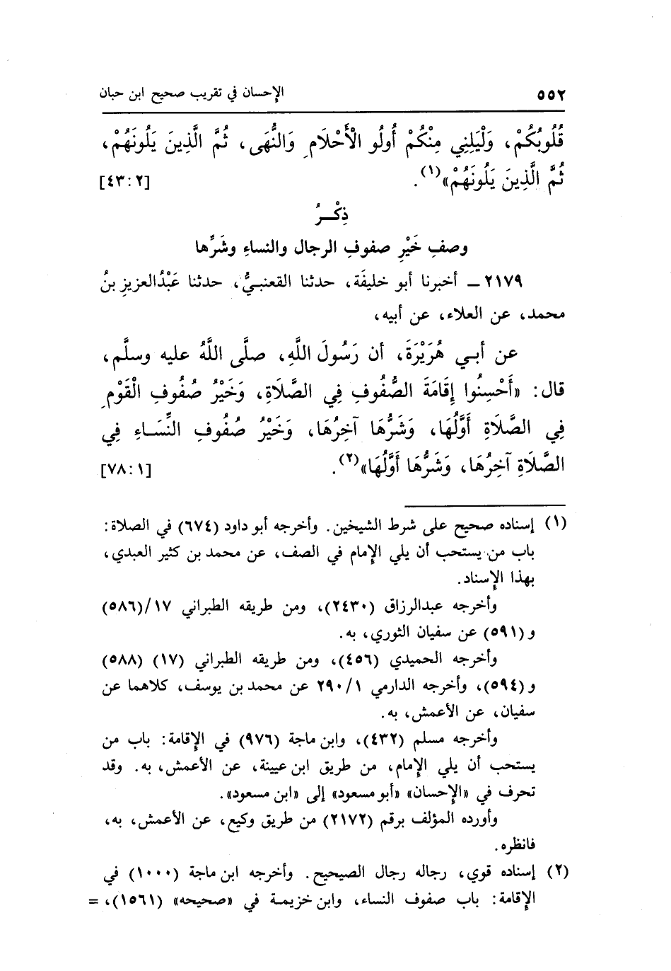 عَنْ أَبِي هُرَيْرَةَ، أَنَّ رَسُولَ اللَّهِ صَلَّى اللَّهُ عَلَيْهِ وَسَلَّمَ، قَالَ: " أَحْسِنُوا إِقَامَةَ الصُّفُوفِ فِي الصَّلَاةِ، وَخَيْرُ صُفُوفِ الْقَوْمِ فِي الصَّلَاةِ أَوَّلُهَا، وَشَرُّهَا آخِرُهَا، وَخَيْرُ صُفُوفِ النِّسَاءِ فِي الصلاة آخرها، وشرها أولها" 2. [1: 78]
