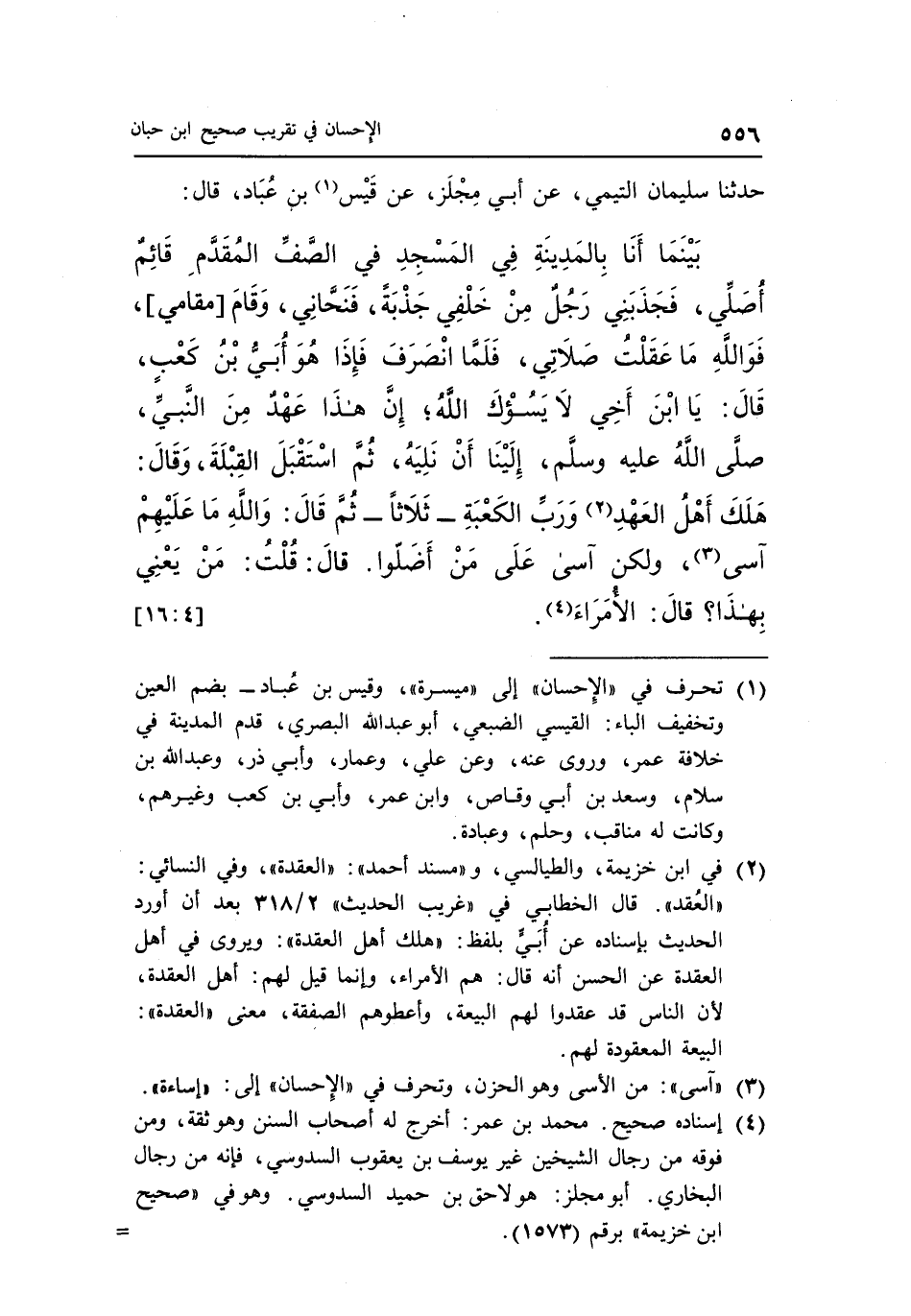 بَيْنَمَا أَنَا بِالْمَدِينَةِ فِي الْمَسْجِدِ فِي الصَّفِّ الْمُقَدَّمِ قَائِمٌ أُصَلِّي، فَجَذَبَنِي رَجُلٌ مِنْ خَلْفِي جَذْبَةً، فَنَحَّانِي، وَقَامَ [مَقَامِي] ، فَوَاللَّهِ مَا عَقَلْتُ صَلَاتِي، فَلَمَّا انْصَرَفَ فَإِذَا هُوَ أُبَيُّ بْنُ كَعْبٍ، قَالَ: يَا ابْنَ أَخِي لَا يَسُؤْكَ اللَّهُ؛ إِنَّ هَذَا عَهْدٌ مِنَ النَّبِيِّ صَلَّى اللَّهُ عَلَيْهِ وَسَلَّمَ، إِلَيْنَا أَنْ نَلِيَهُ، ثُمَّ اسْتَقْبَلَ الْقِبْلَةَ، وَقَالَ: هَلَكَ أَهْلُ الْعَهْدِ2 وَرَبِّ الْكَعْبَةِ -ثَلَاثًا- ثُمَّ قَالَ: وَاللَّهِ مَا عَلَيْهِمْ آسَى3، وَلَكِنْ آسَى عَلَى مَنْ أَضَلُّوا. قَالَ: قُلْتُ: مَنْ يَعْنِي بهذا؟ قال: الأمراء4. [4: 16]