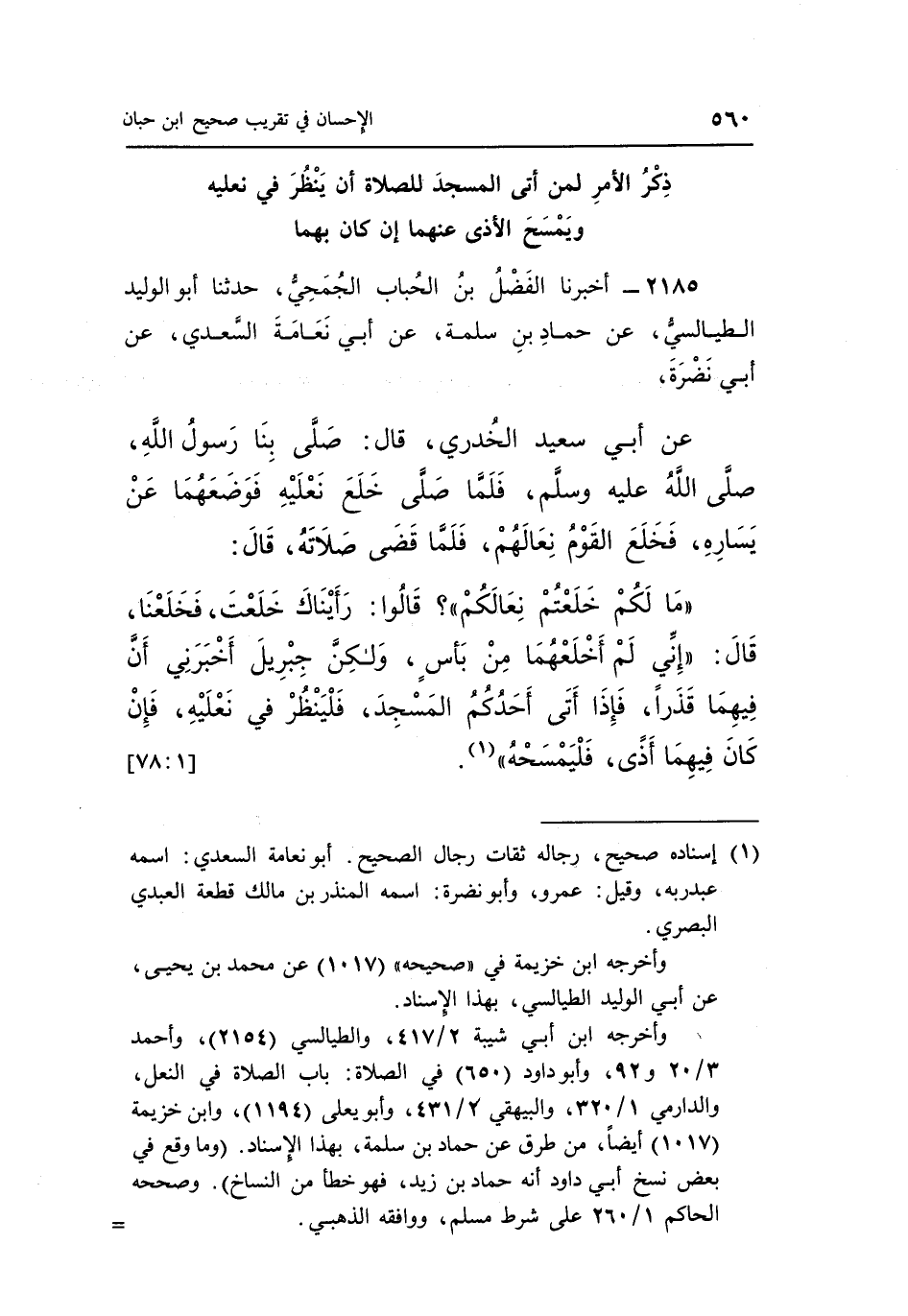 وأخرجه ابن أبي شيبة 2/417، والطيالسي "2154"، وأحمد 3/20 و92، وأبو داود "650" في الصلاة: باب الصلاة في النعل، والدارمي 1/320، والبيهقي 2/431، وأبو يعلى "1194"، وابن خزيمة "1017" أيضا، من طرق عن حماد بن سلمة، بهذا الإٍسناد. "وما وقع في بعض النسخ أبي داود أنه حماد بن زيد، فهو خطأ من النساخ". وصحَّحه الحاكم 1/260 على شرطِ مُسلمٍ، ووافقه الذهبي. =\