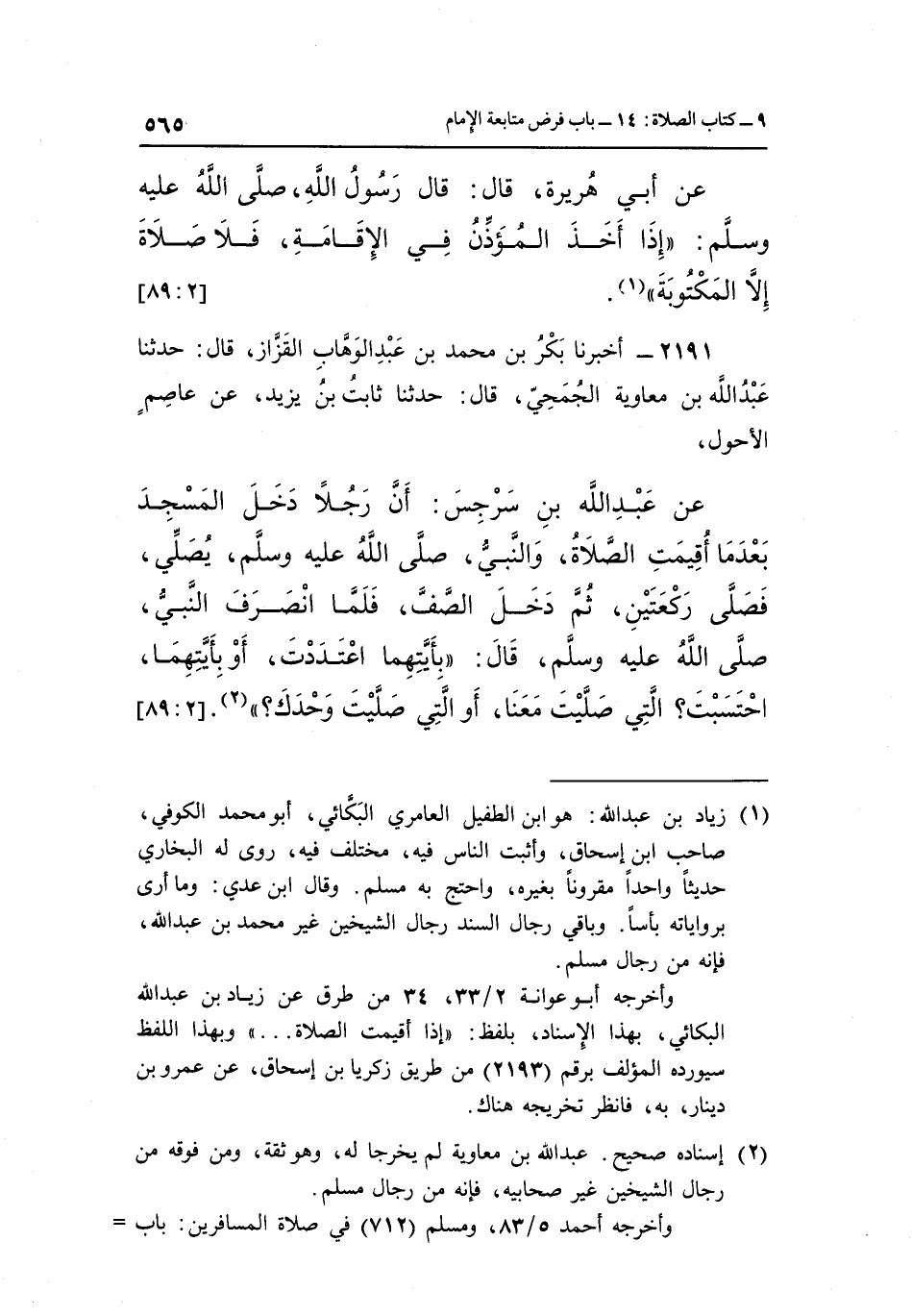 وأخرجه أبو عوانة 2/33،34 من طرق عن زياد بن عبد الله البكائي، بهذا الإسناد، بلفظ: "إذا أقيمت الصلاة ... " وبهذا اللفظ سيورده المؤلف برقم "2193" من طريق زَكَرِيَّا بْنُ إِسْحَاقَ، عَنْ عَمْرِو بْنِ دِينَارٍ، به، فانظر تخريجه هناك.