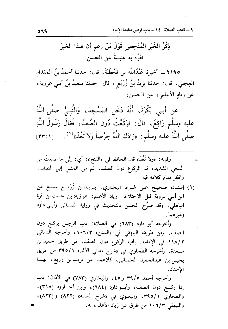 وأخرجه أحمد 5/39 و45، والبخاري "783" في الأذان: باب إذا ركع دون الصف، وأبو داود "684"، وابن الجارود "318"، والطحاوي 1/395، والبغوي في "شرح السنة" "822" و "823"، والبيهقي 3/106 من طرق عن زياد الأعلم، به. وأخرجه الطيالسي "876" عن أبي حرة، وعبد الرزاق "3376"، ومن طريقه أحمد 5/46، من طريق قتادة، كلاهما عن الحسن، به.