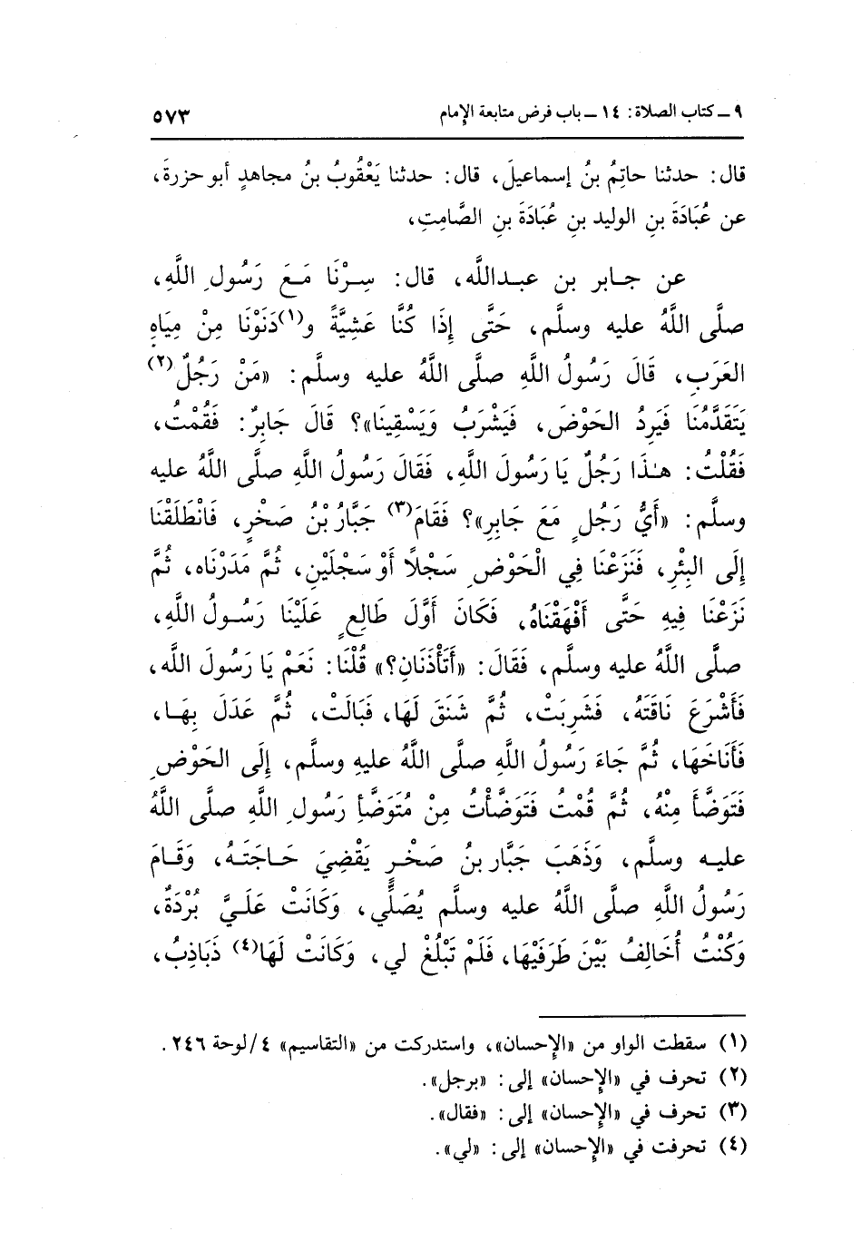 عَنْ جَابِرِ بْنِ عَبْدِ اللَّهِ، قَالَ: سِرْنَا مَعَ رَسُولِ اللَّهِ صَلَّى اللَّهُ عَلَيْهِ وَسَلَّمَ، حَتَّى إذا كنا عشية و1دنونا مِنْ مِيَاهِ الْعَرَبِ، قَالَ رَسُولُ اللَّهِ صَلَّى اللَّهُ عَلَيْهِ وَسَلَّمَ: "مَنْ رَجُلٌ2 يَتَقَدَّمُنَا فَيَرِدُ الْحَوْضَ، فَيَشْرَبُ وَيَسْقِينَا"؟ قَالَ جَابِرٌ: فَقُمْتُ، فَقُلْتُ: هَذَا رَجُلٌ يَا رَسُولَ اللَّهِ، فقَالَ رَسُولُ اللَّهِ صَلَّى اللَّهُ عَلَيْهِ وَسَلَّمَ: "أَيُّ رَجُلٍ مَعَ جَابِرٍ"؟ فَقَامَ3 جَبَّارُ بْنُ صَخْرٍ، فَانْطَلَقْنَا إِلَى الْبِئْرِ، فَنَزَعْنَا فِي الْحَوْضِ سَجْلًا أَوْ سَجْلَيْنِ، ثُمَّ مَدَرْنَاهُ، ثُمَّ نَزَعْنَا فِيهِ حَتَّى أَفْهَقْنَاهُ، فَكَانَ أَوَّلَ طَالِعٍ عَلَيْنَا رَسُولُ اللَّهِ صَلَّى اللَّهُ عَلَيْهِ وَسَلَّمَ، فَقَالَ: "أَتَأْذَنَانِ؟ " قُلْنَا: نَعَمْ يَا رَسُولَ اللَّهِ، فَأَشْرَعَ نَاقَتَهُ، فَشَرِبَتْ، ثُمَّ شَنَقَ لَهَا، فَبَالَتْ، ثُمَّ عَدَلَ بِهَا، فَأَنَاخَهَا، ثُمَّ جَاءَ رَسُولُ اللَّهِ صَلَّى اللَّهُ عَلَيْهِ وَسَلَّمَ، إِلَى الْحَوْضِ فَتَوَضَّأَ مِنْهُ، ثُمَّ قُمْتُ فَتَوَضَّأْتُ مِنْ مُتَوَضَّأِ رَسُولِ اللَّهِ صَلَّى اللَّهُ عَلَيْهِ وَسَلَّمَ، وَذَهَبَ جَبَّارُ بْنُ صَخْرٍ يَقْضِي حَاجَتَهُ، وَقَامَ رَسُولَ اللَّهِ صَلَّى اللَّهُ عَلَيْهِ وَسَلَّمَ يُصَلِّي، وَكَانَتْ عَلَيَّ بُرْدَةٌ، وَكُنْتُ أُخَالِفُ بَيْنَ طَرَفَيْهَا، فَلَمْ تَبْلُغْ لِي، وَكَانَتْ لها4 ذباذب،