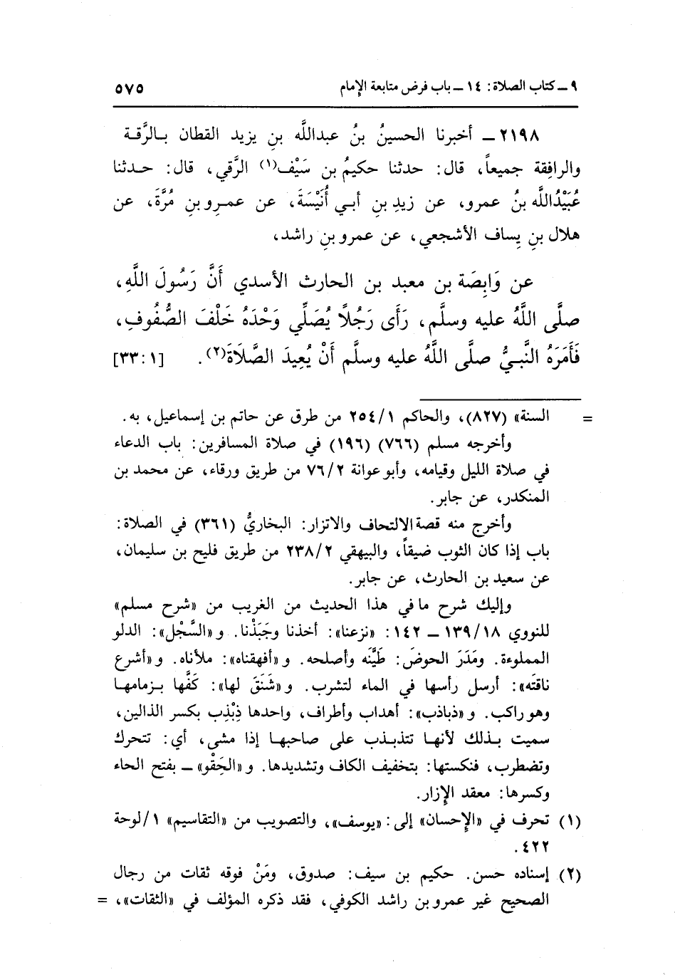 عَنْ وَابِصَةَ بْنِ مَعْبَدِ بْنِ الْحَارِثِ الْأَسَدِيِّ أَنَّ رَسُولَ اللَّهِ صَلَّى اللَّهُ عَلَيْهِ وَسَلَّمَ، رَأَى رَجُلًا يُصَلِّي وَحْدَهُ خَلْفَ الصُّفُوفِ، فَأَمَرَهُ النَّبِيُّ صَلَّى اللَّهُ عَلَيْهِ وَسَلَّمَ أَنْ يُعِيدَ الصَّلَاةَ2. [1: 33]